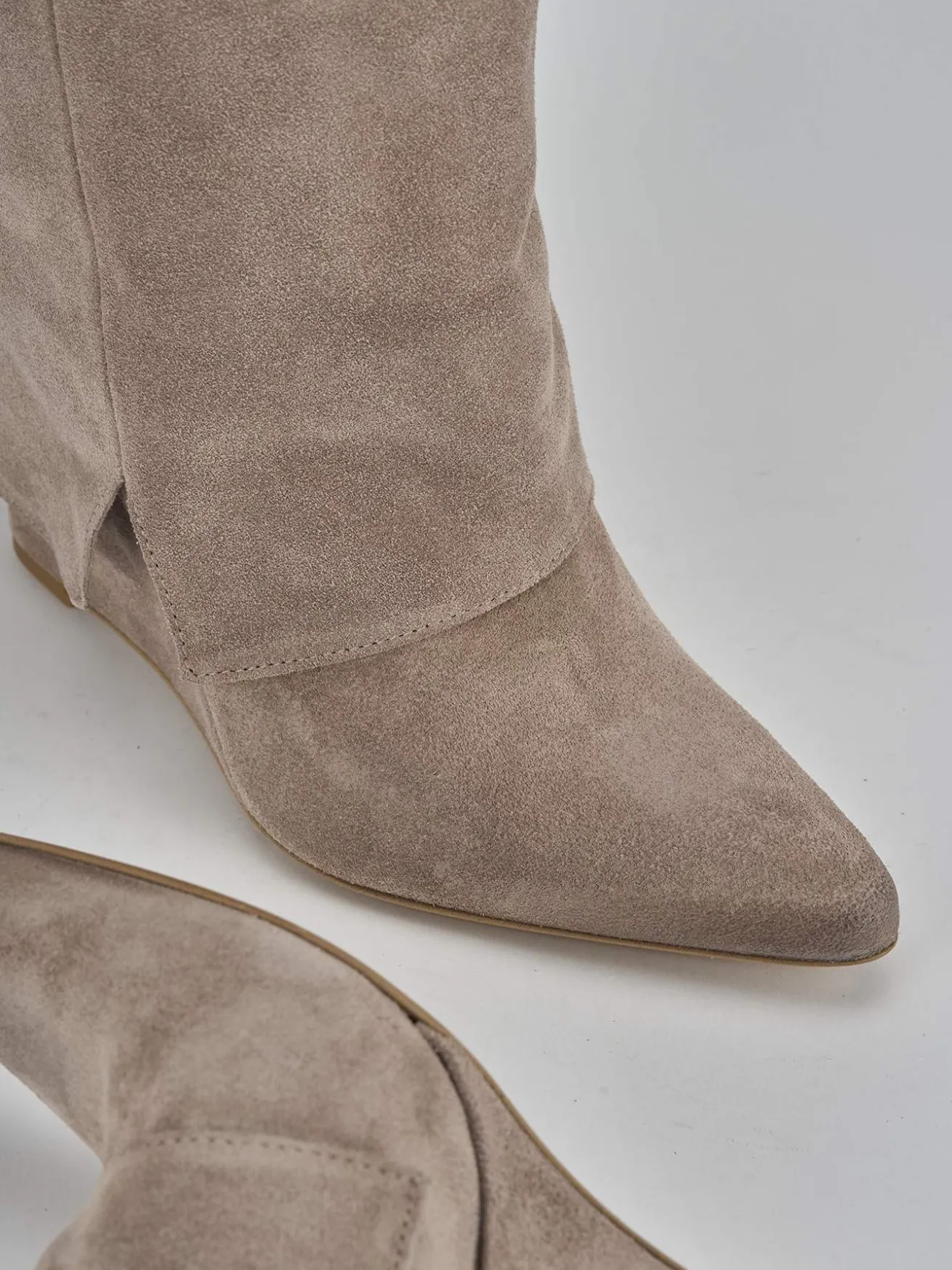 Stivale tacco zeppa 9 cm fondo in leggera gomma e soletto interno in vera pelle. Tomaia in morbida pelle scamosciata, punta sfilata, risvolto sul gambale che misura appena sopra il ginocchio e tacco stabile dato dalla zeppa a tutta altezza. Perfetto con qualsiasi tuo outfit.