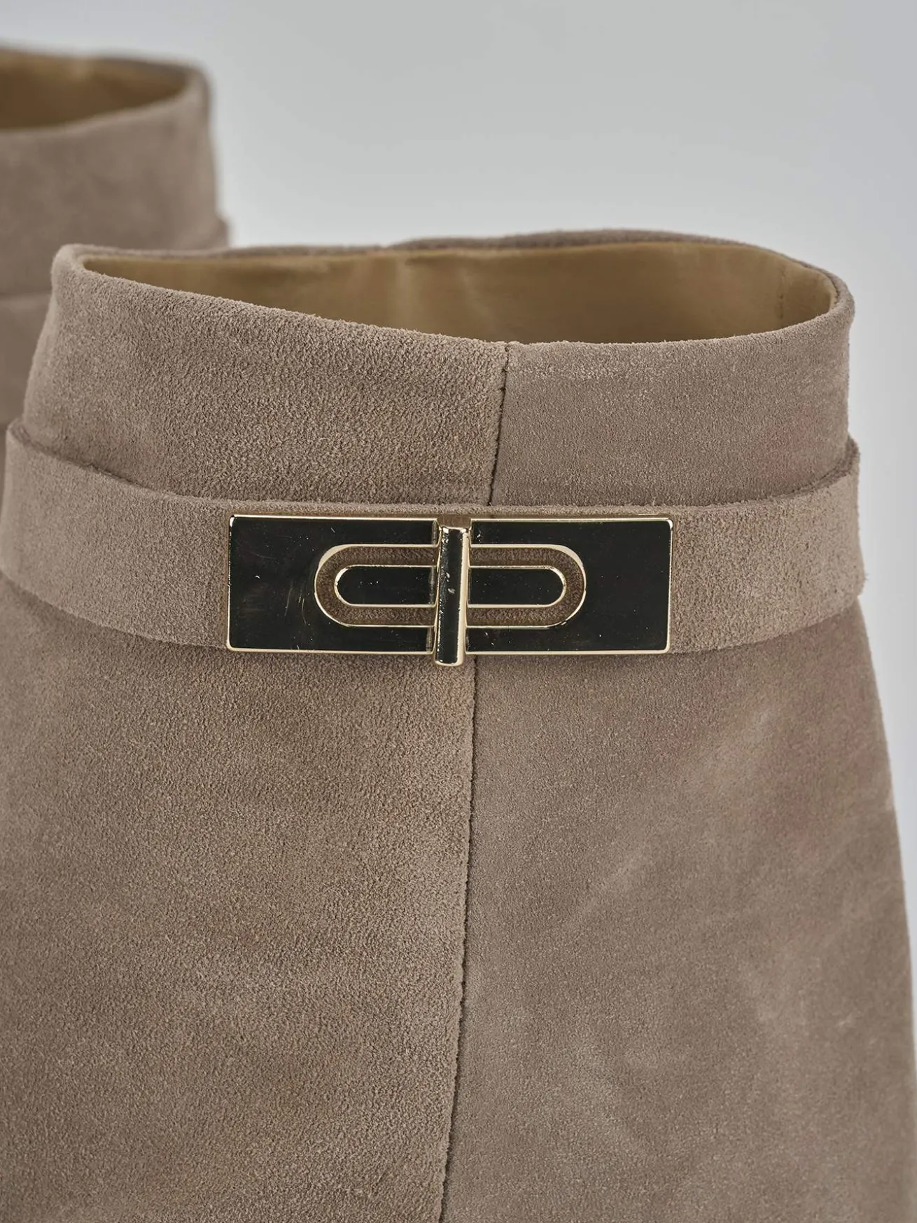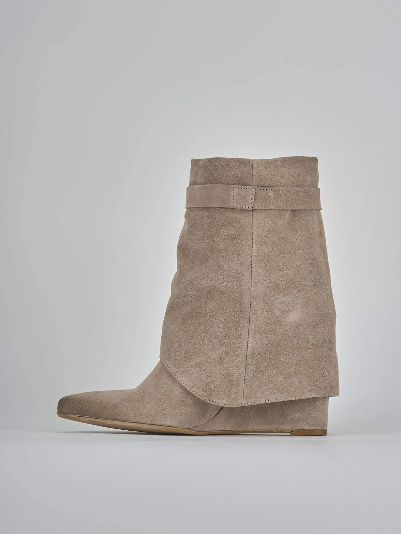 Stivale zeppa 9 cm fondo in leggera gomma e soletto interno in vera pelle. Tomaia in morbido camoscio, punta sfilata, risvolto con piccolo spacco sul gambale che misura a 3/4 del polpaccio, cinturino con accessorio in metallo e zeppa stabile. Perfetto con una gonna e una camicia.