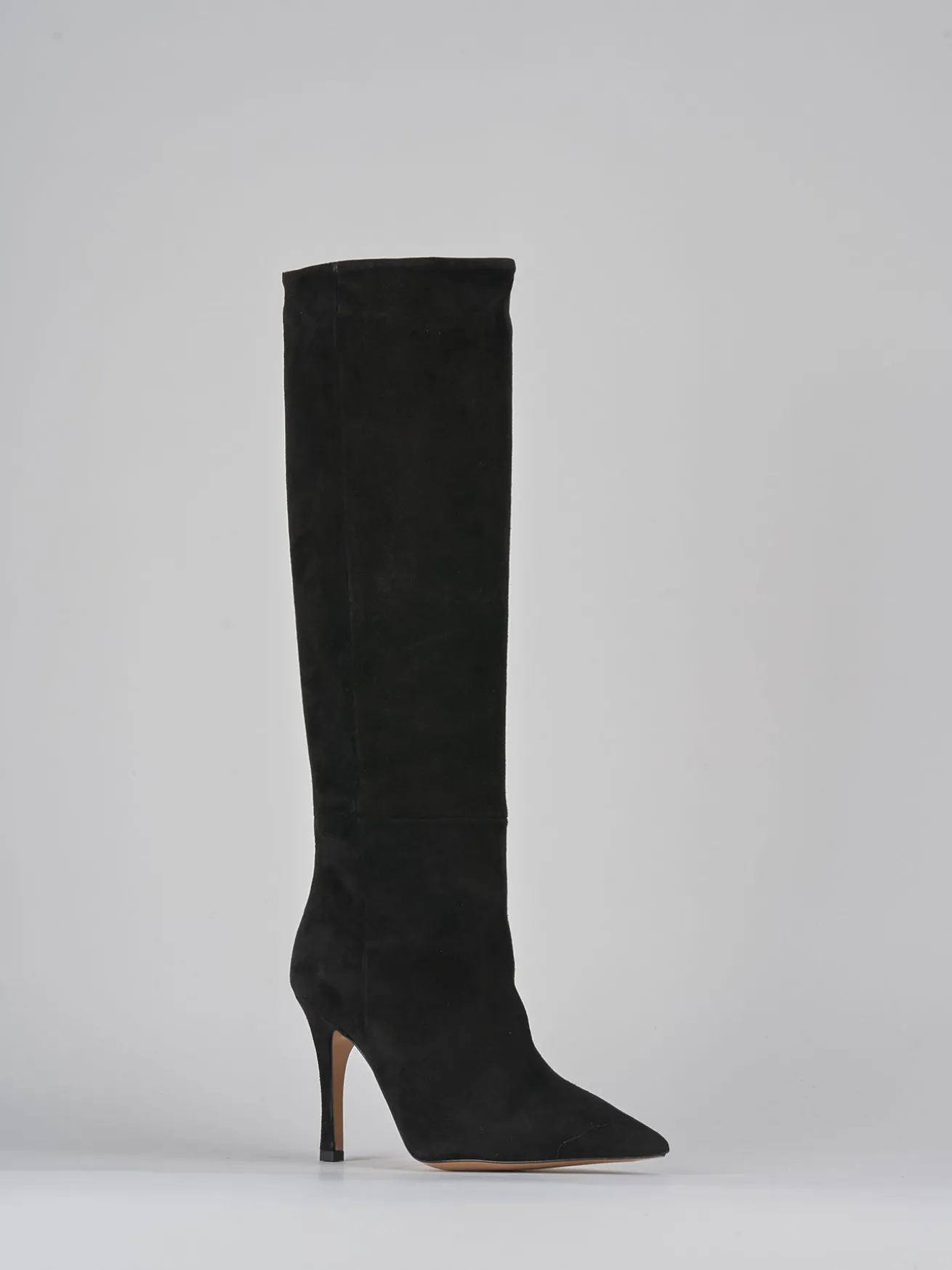 stivale tacco 8.5 cm fondo in leggera gomma e soletto interno in vera pelle. tomaia in morbida pelle scamosciata, punta sfilata, liscio, tacco rocchetto e altezza gambale appena sotto il ginocchio. perfetta versatilità per tutte le tue occasioni e per ogni stagione.