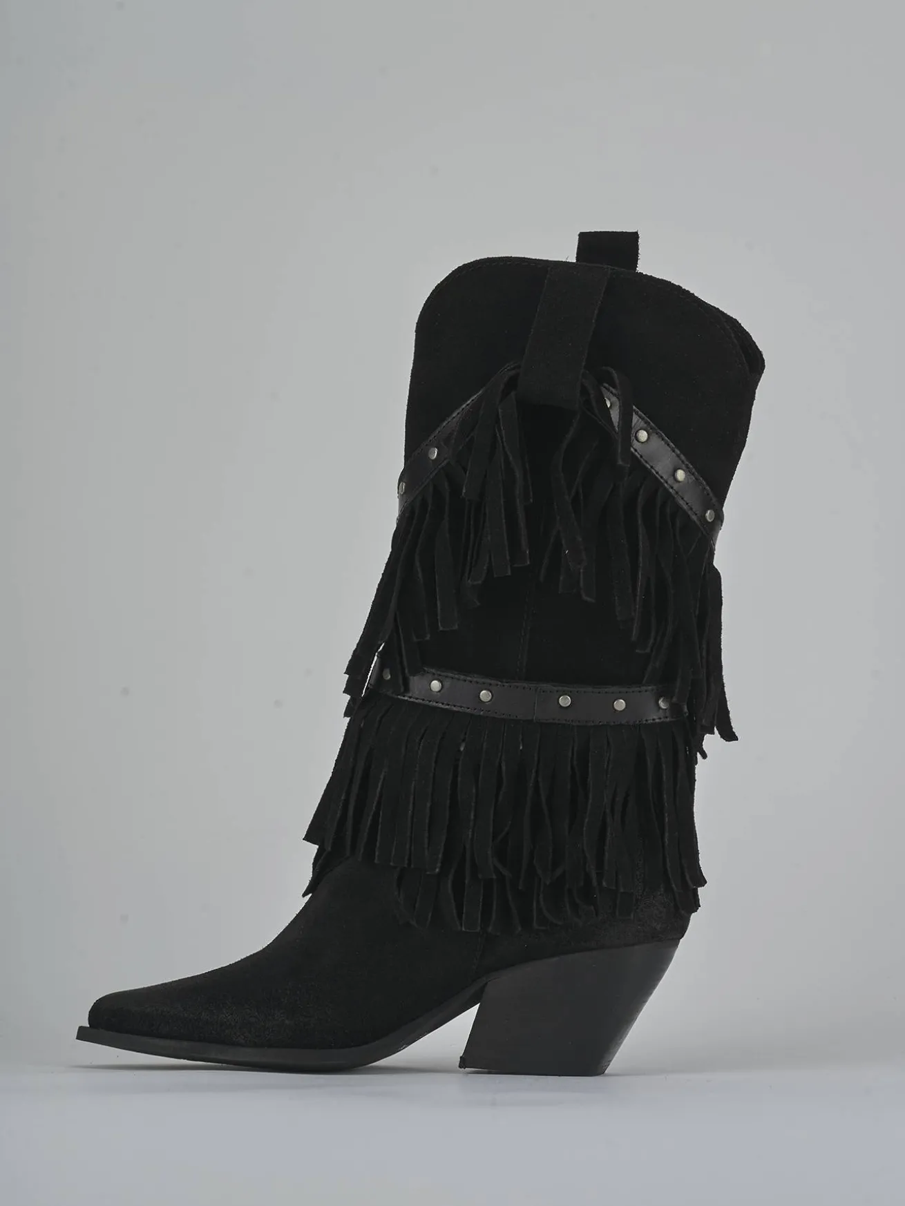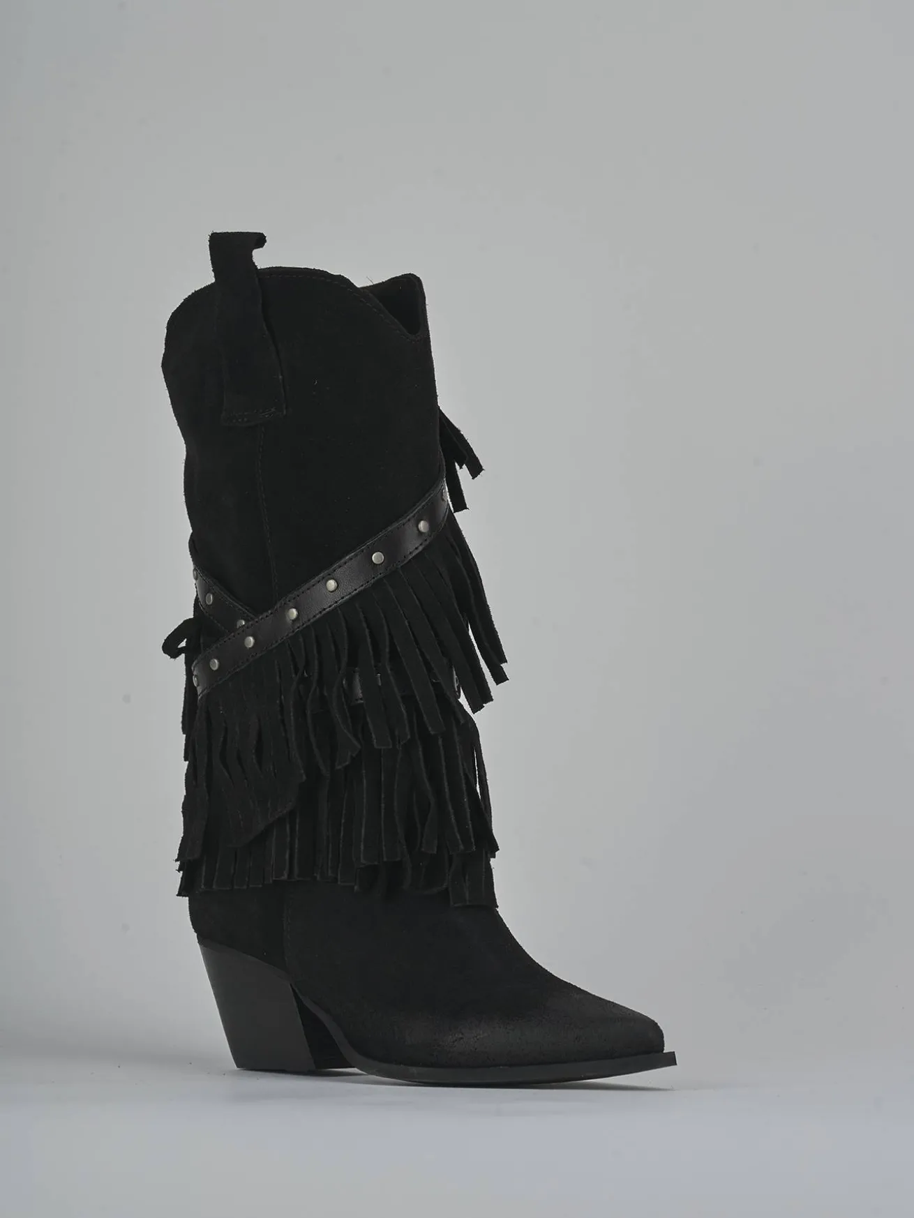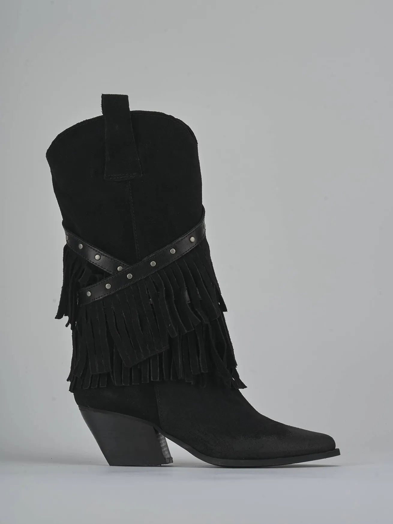 La punta sfilata e i cinturini con borchie incrociati sul gambale a metà polpaccio conferiscono un look deciso e moderno.
