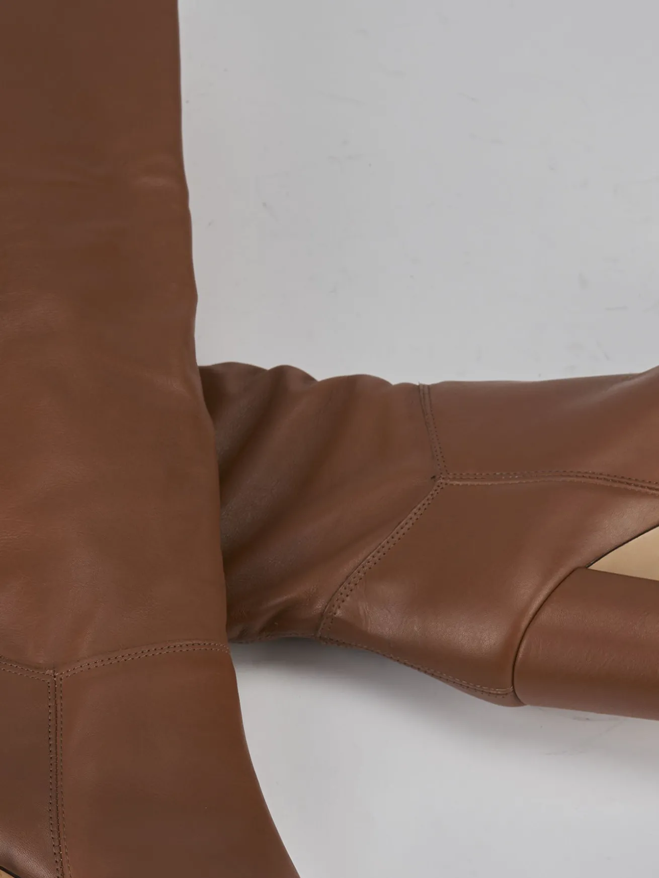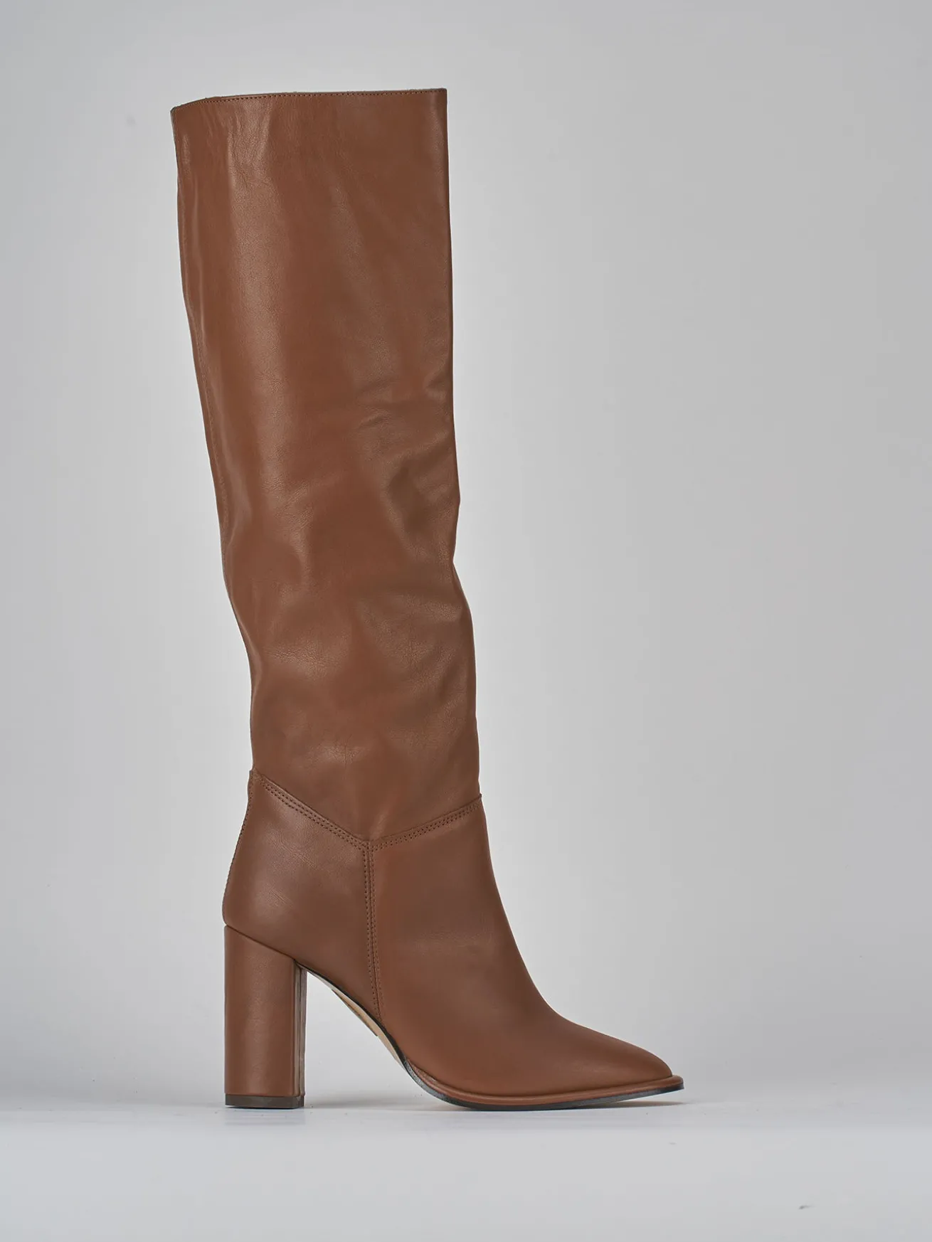 stivale tacco 8.5 cm fondo in leggera gomma e soletto interno in vera pelle. tomaia in morbida pelle, punta sfilata, cuciture a vista, gambale sfoderato tubolare che misura appena sopra il ginocchio. guardolo sporgente e tacco grosso. perfetto con un vestito o un paio di jeans.