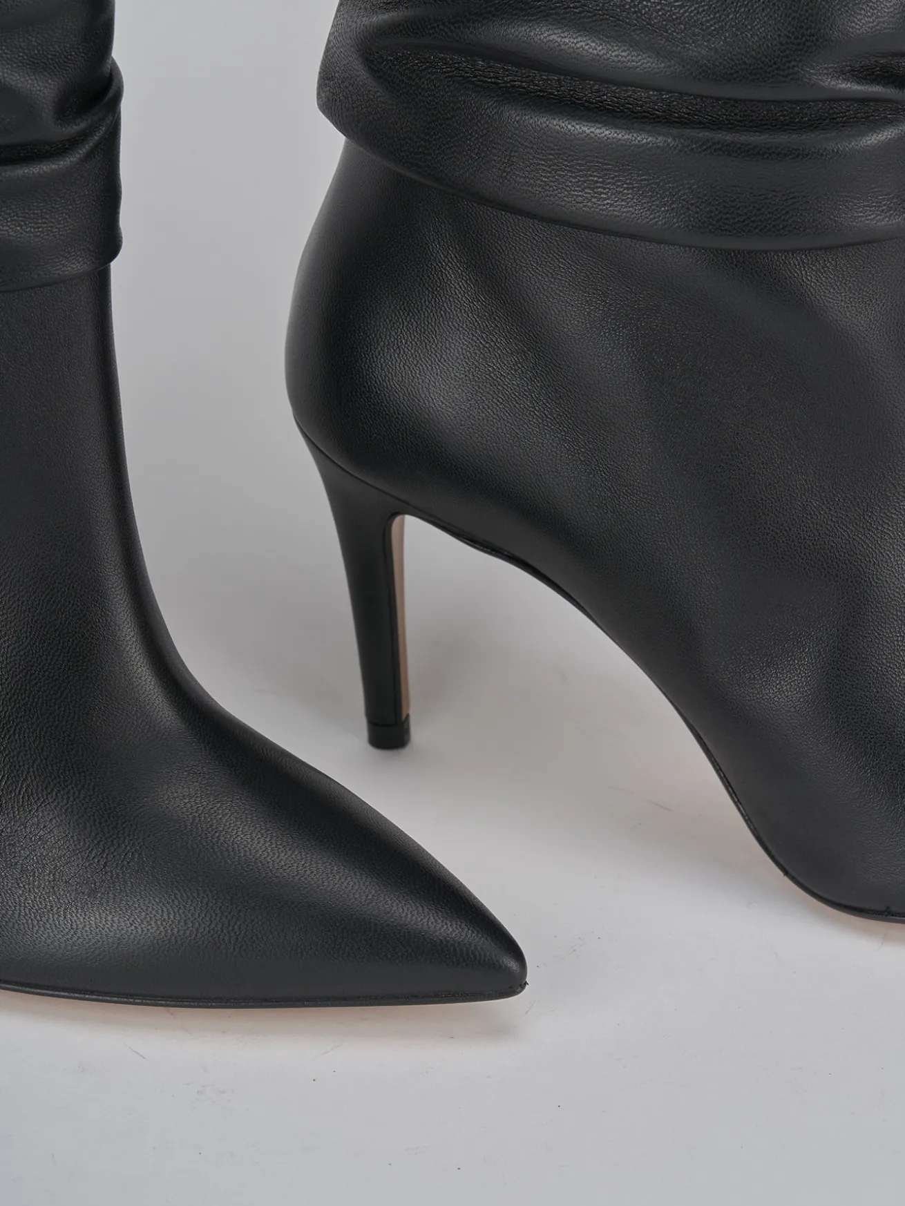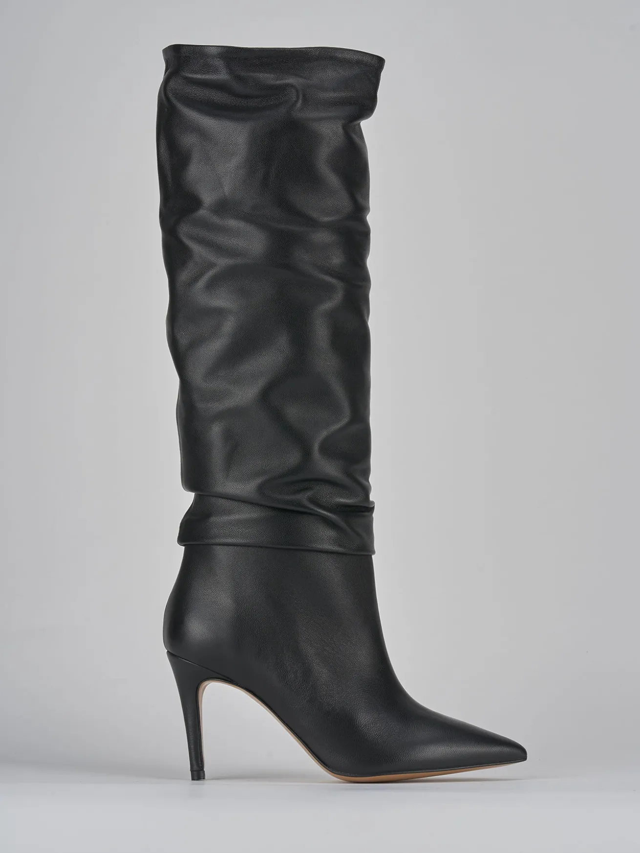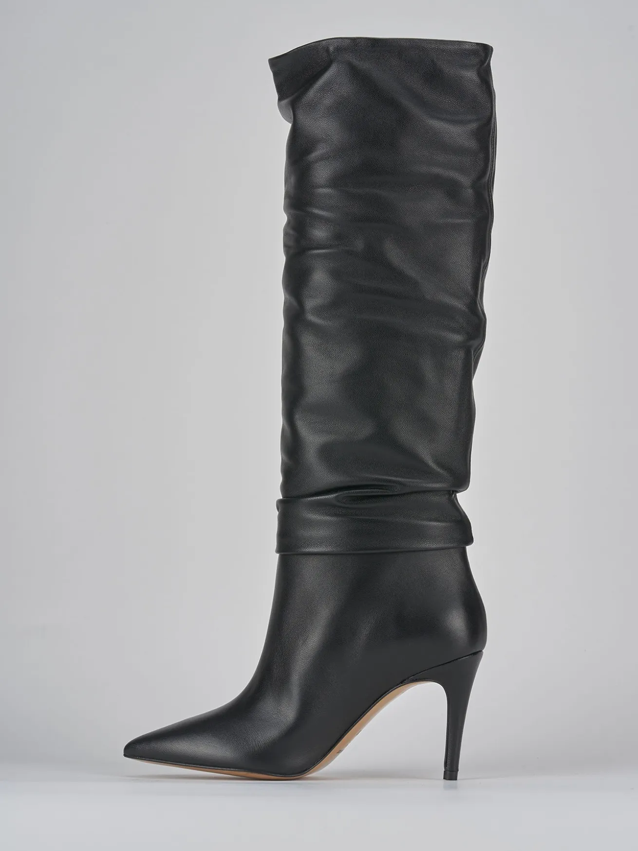 stivale tacco 8.5 cm fondo in leggera gomma e soletto interno in vera pelle. tomaia in morbida pelle nappata, punta sfilata, gambale appena sotto il ginocchio e arricciato, tacco fino per un look cool.