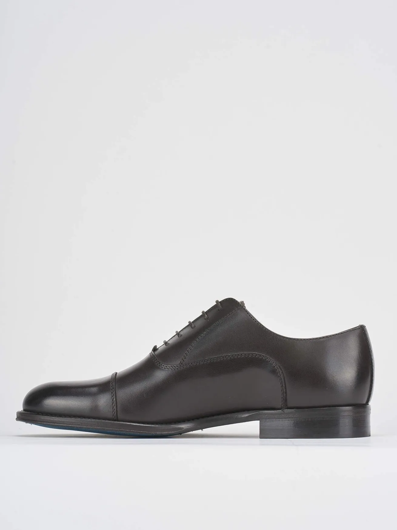 La scarpa presenta una raffinata allacciatura a cinque fori, che si adatta perfettamente al piede, mentre la punta affusolata e il puntale evidenziato da doppia cucitura aggiungono un tocco di classe artigianale.