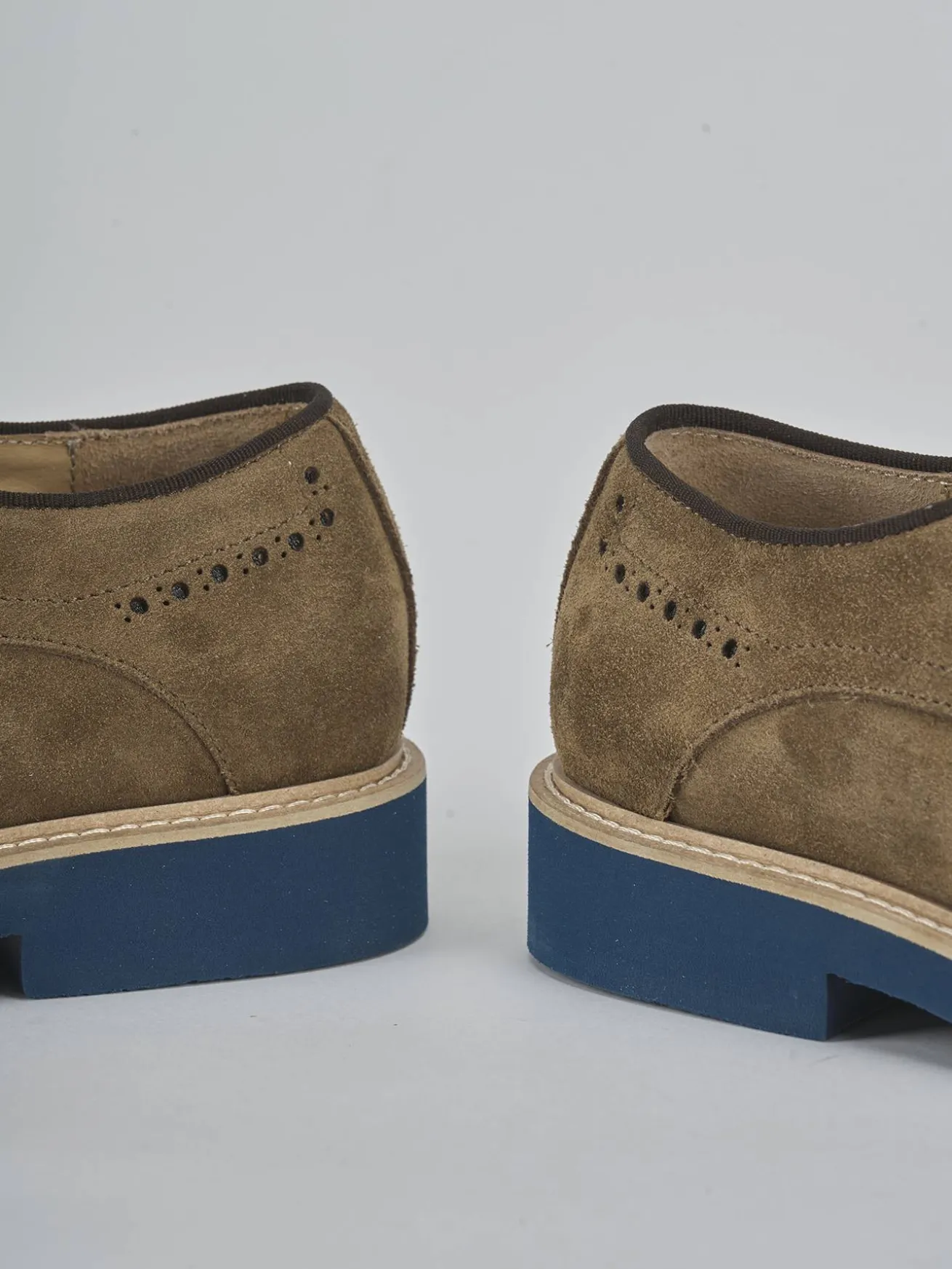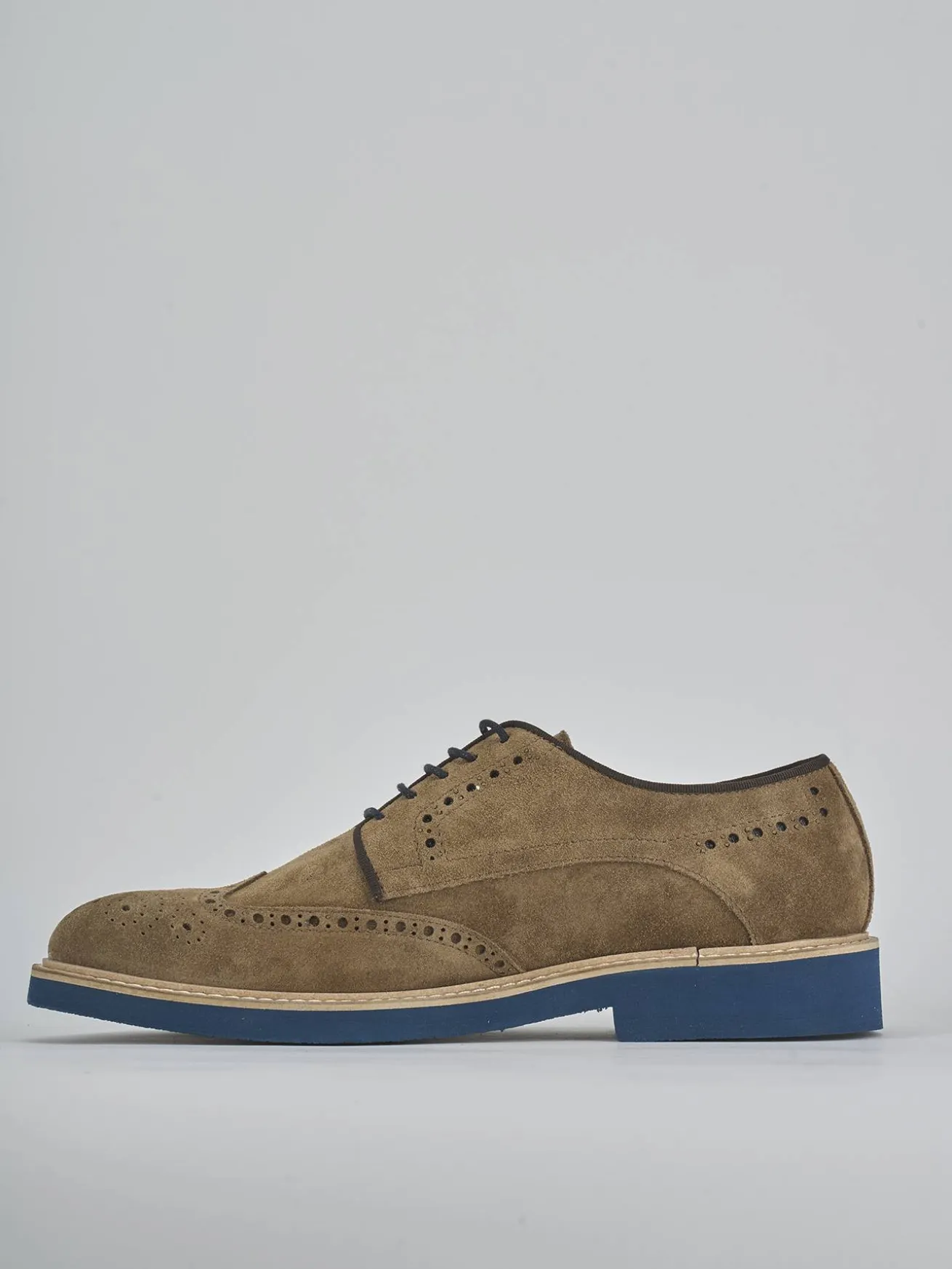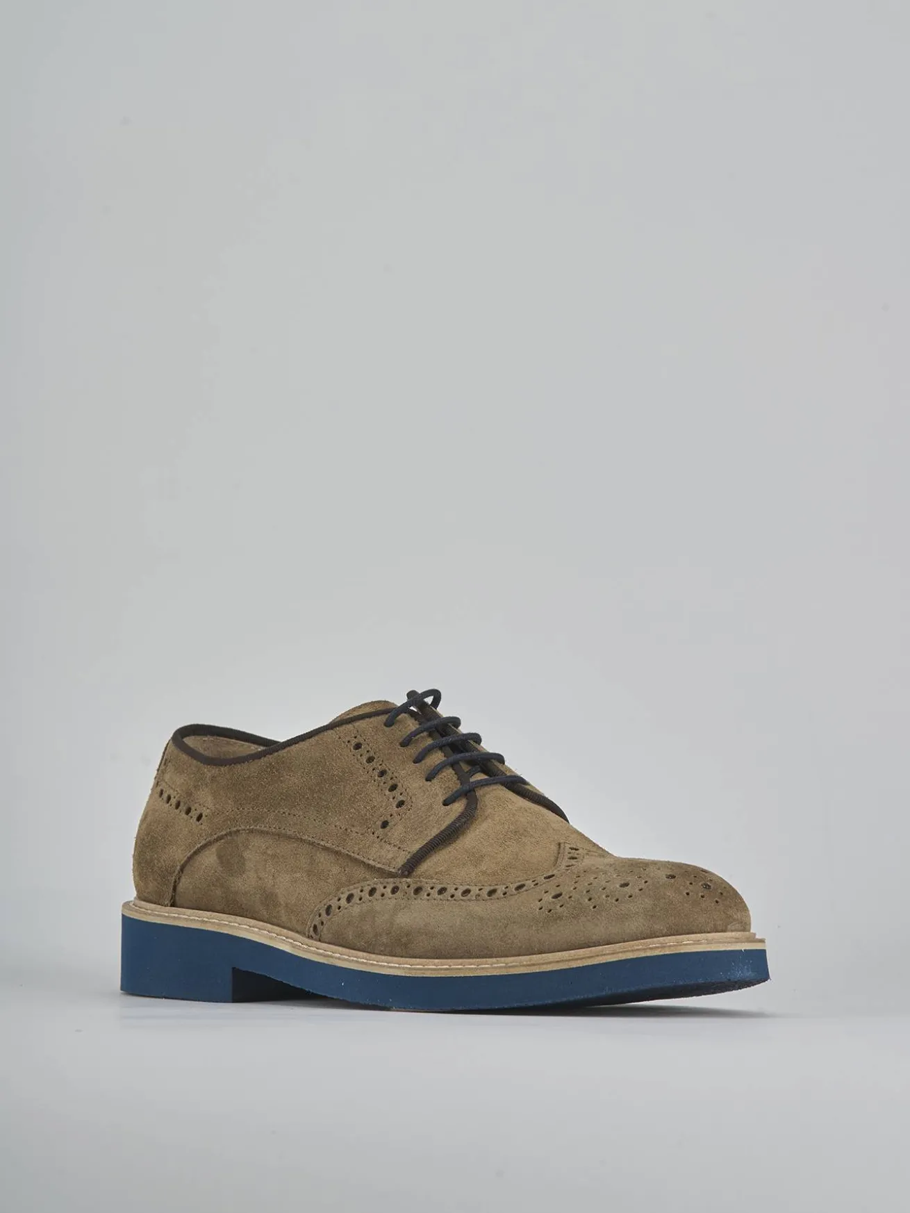 Il modello derby è arricchito da una punta affusolata e una pregiata lavorazione inglese, con cuciture a mano che esaltano la qualità artigianale.