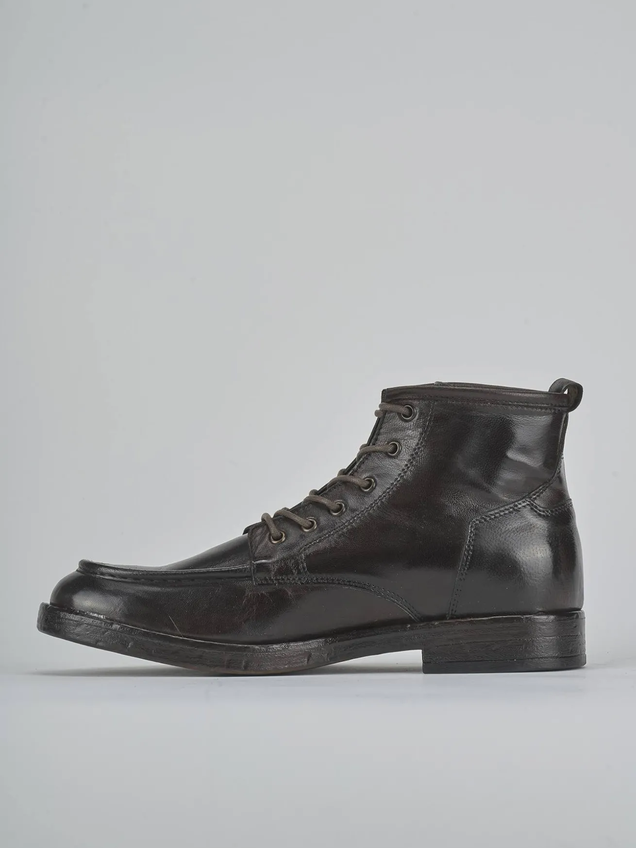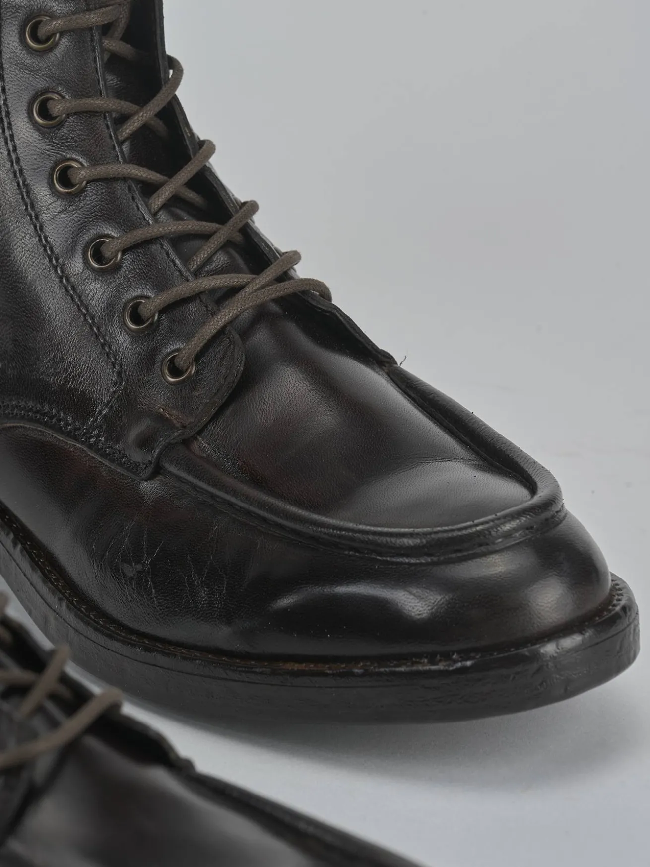 Le cuciture a mano in rilievo aggiungono un tocco artigianale, mentre i lacci con occhielli in metallo garantiscono una chiusura sicura e resistente.