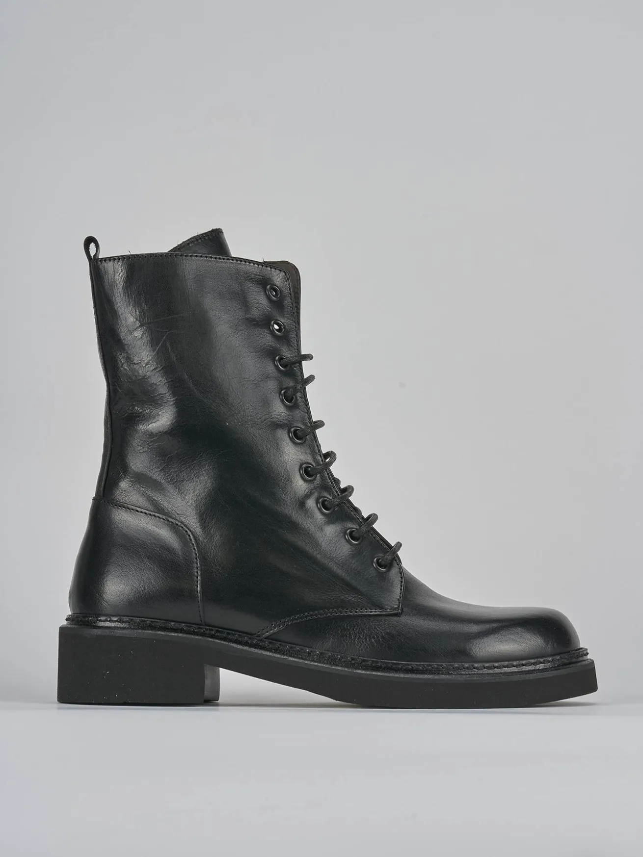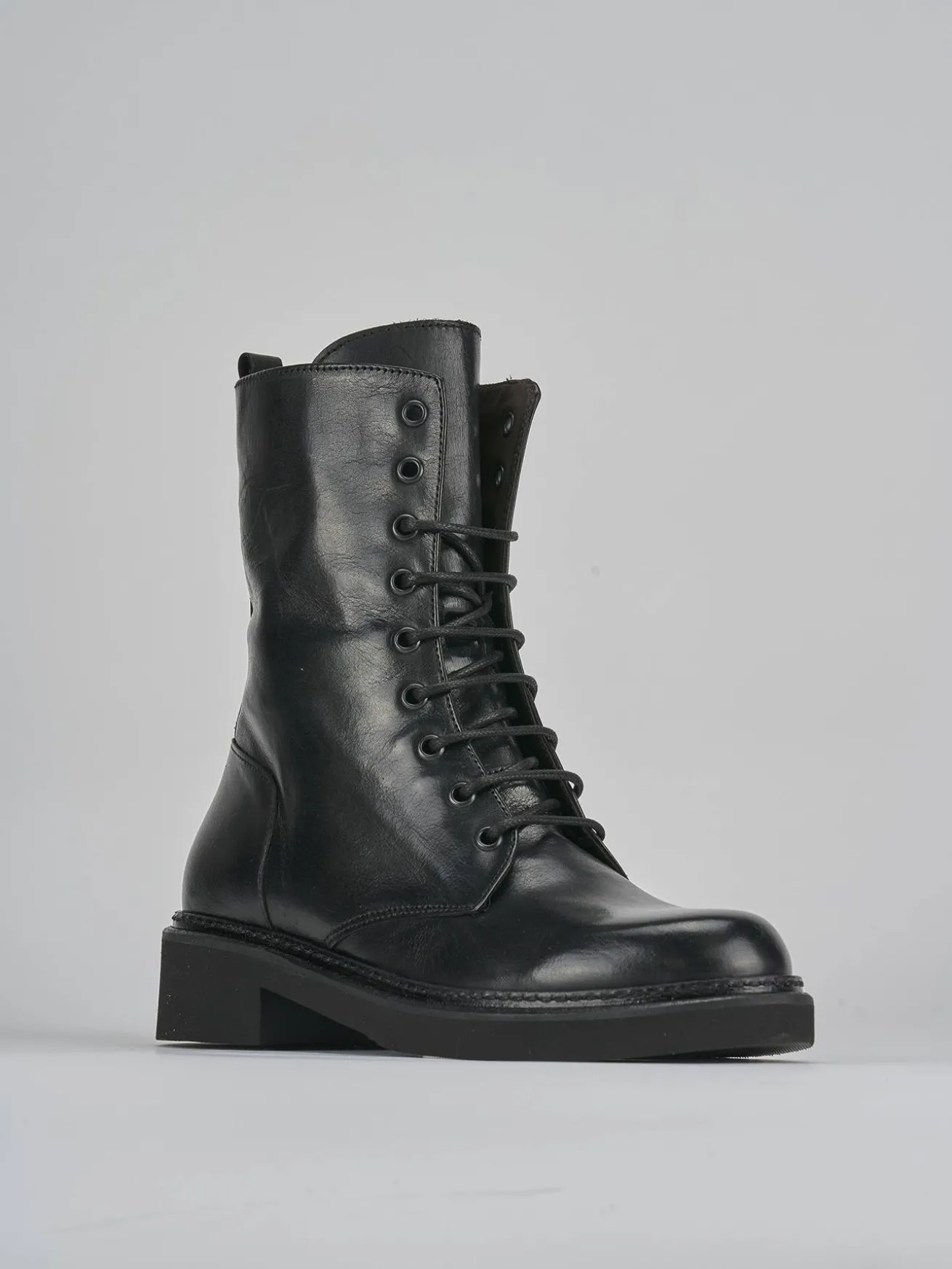 La tomaia in pelle nera avvolge il piede con classe, mentre l’allacciatura alta a 9 buchi garantisce una calzata perfetta fino alla caviglia.