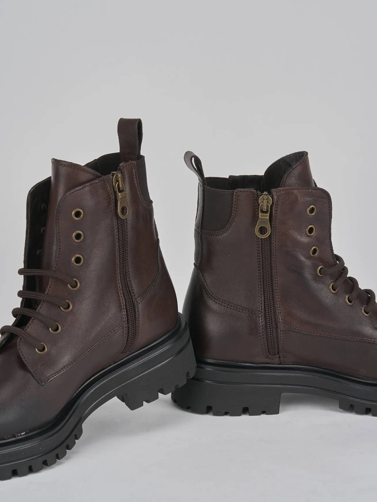 Anfibio fondo in gomma carrarmato 3cm e soletto interno in vera pelle. Tomaia in morbida pelle, punta tonda, lace e allacciatura su tutto il collo del piede con occhielli in metallo e comoda cerniera laterale per un look cool.
