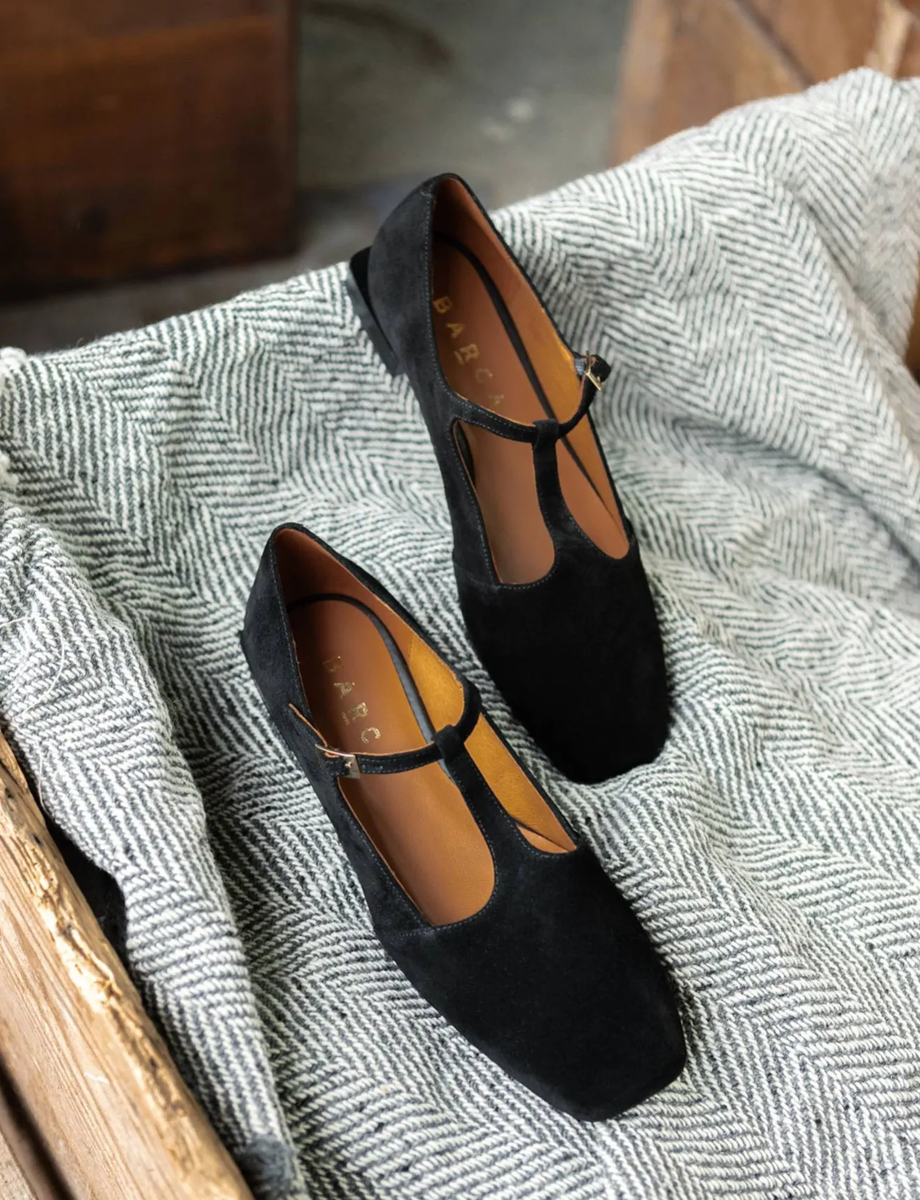 La tomaia in morbido camoscio avvolge delicatamente il piede, mentre la punta squadrata aggiunge un tocco di modernità.