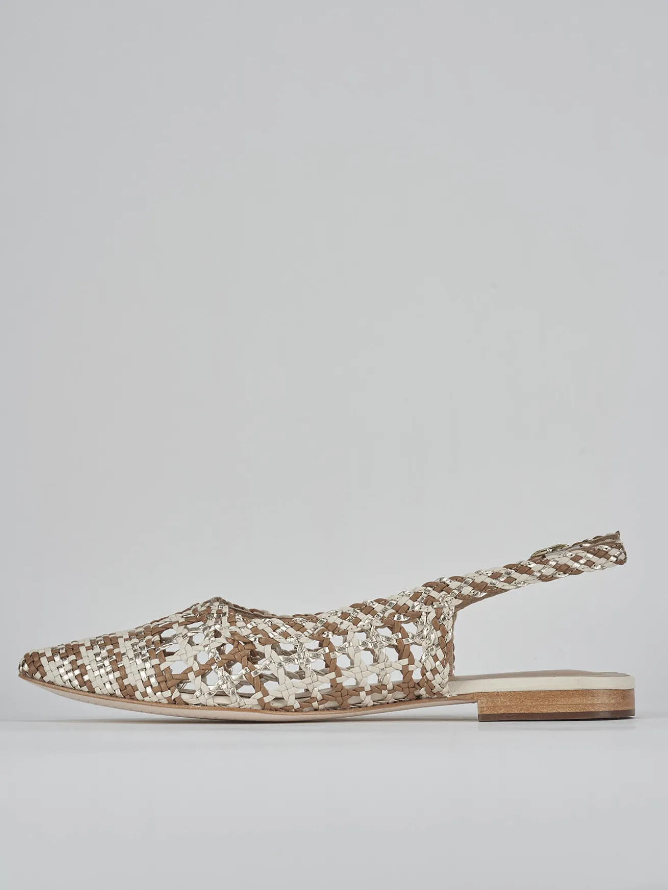 Realizzate in morbida pelle beige, queste scarpe esaltano un design finemente intrecciato tricolor che cattura l’attenzione.