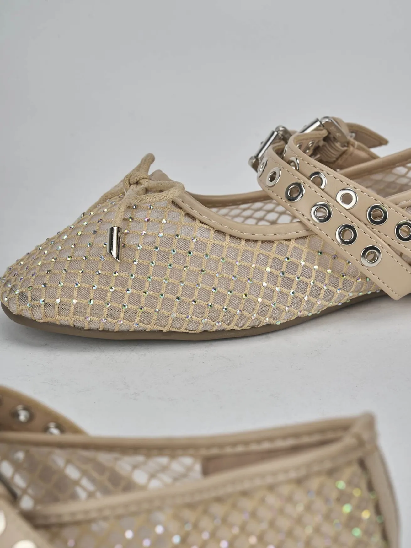 Il fiocco impreziosito da strass e i due cinturini con fibbia regolabile e borchie forate creano un look chic e contemporaneo.