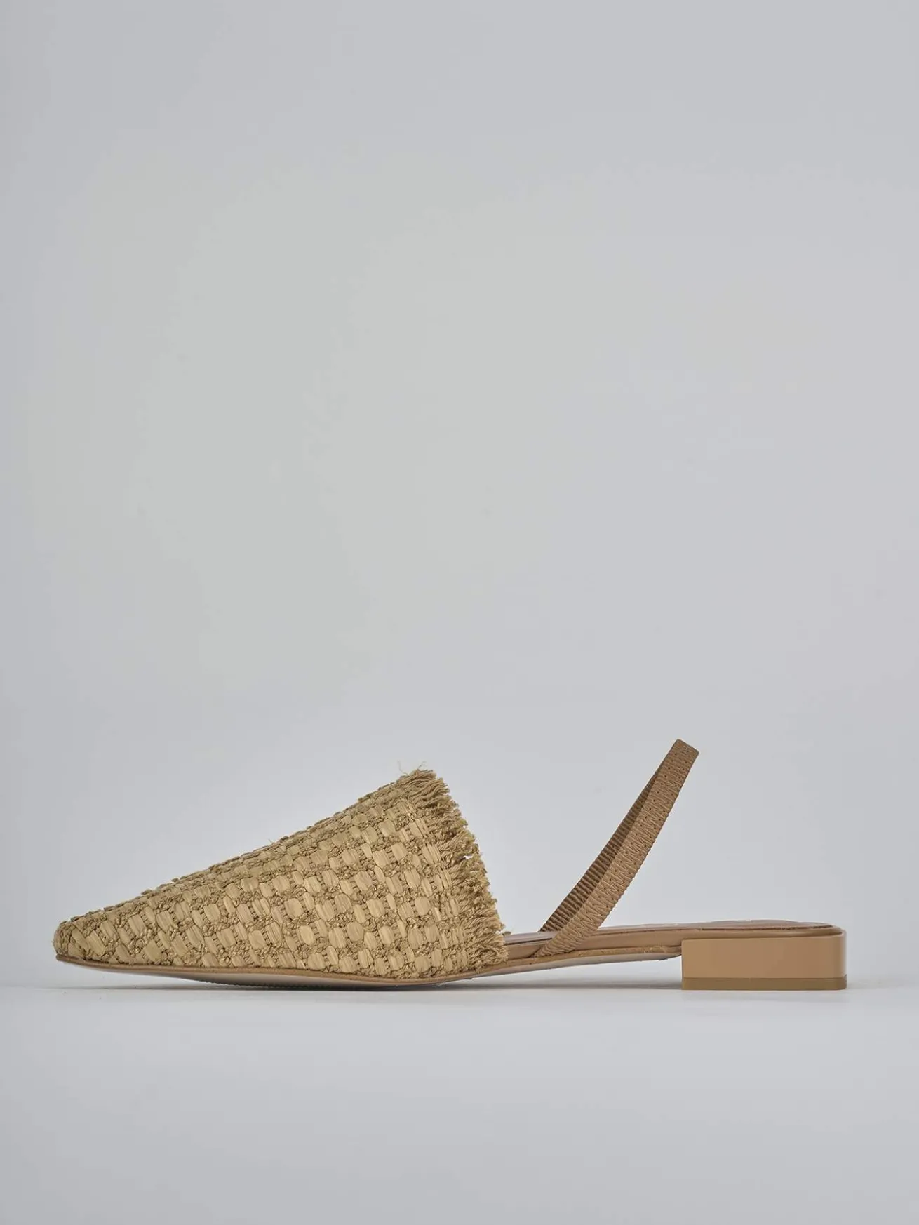 La tomaia è foderata in rafia, con una punta sfilata e dettagli di frange per un tocco di originalità.