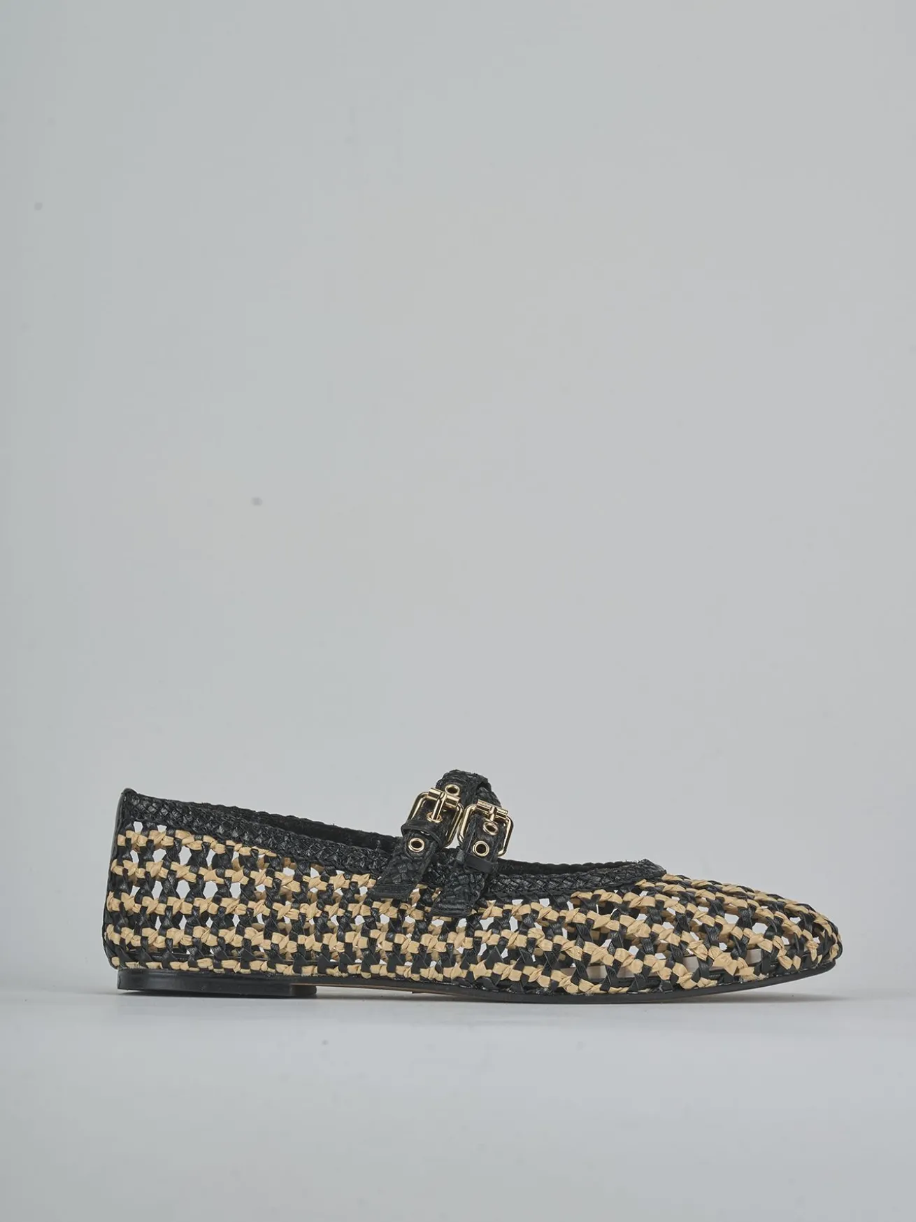 La tomaia presenta un intreccio bicolore nero e naturale, creando un effetto visivo accattivante e sofisticato.