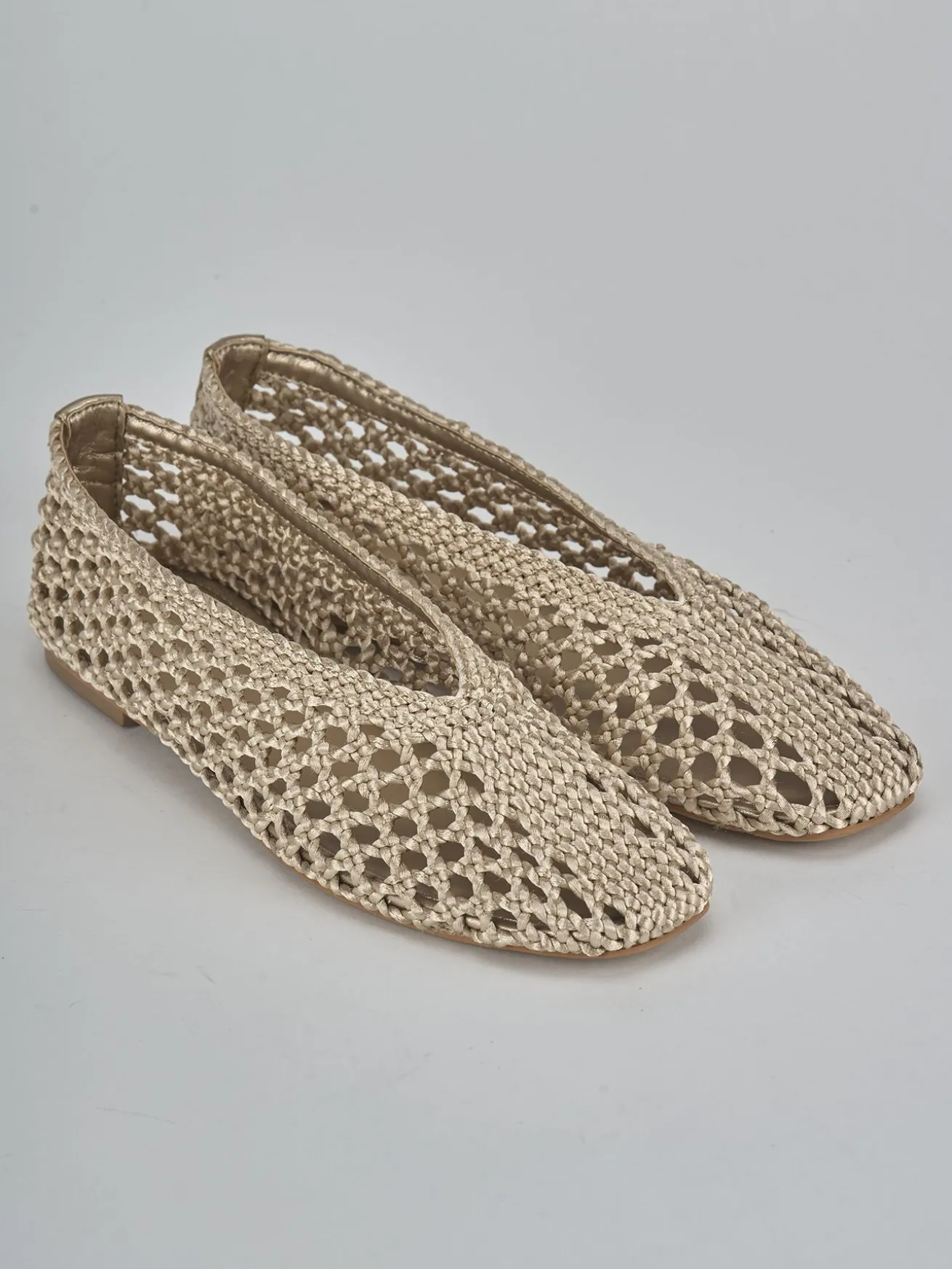 Realizzate in un tessuto beige laminato traforato e intrecciato, queste calzature offrono un design unico e sofisticato.