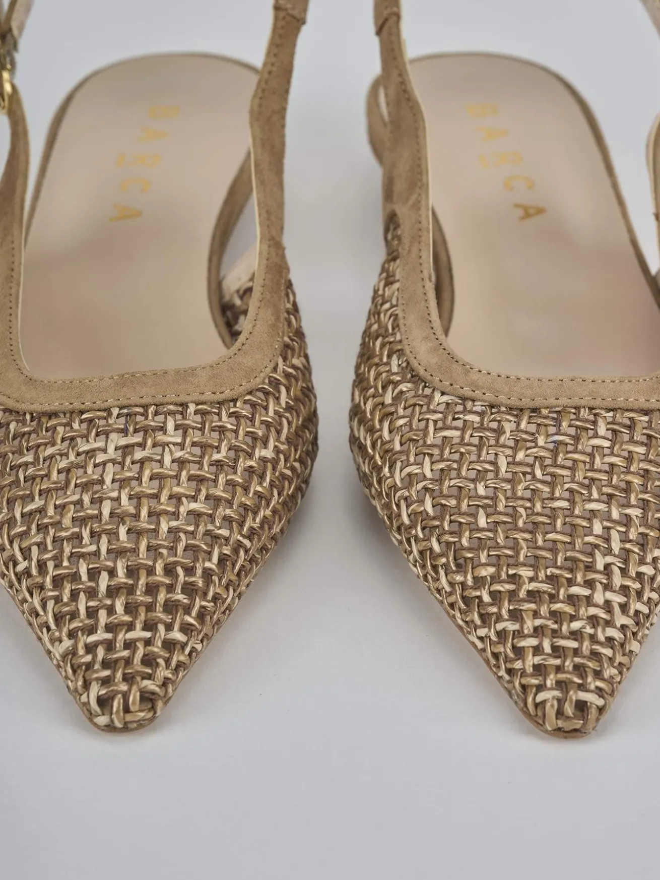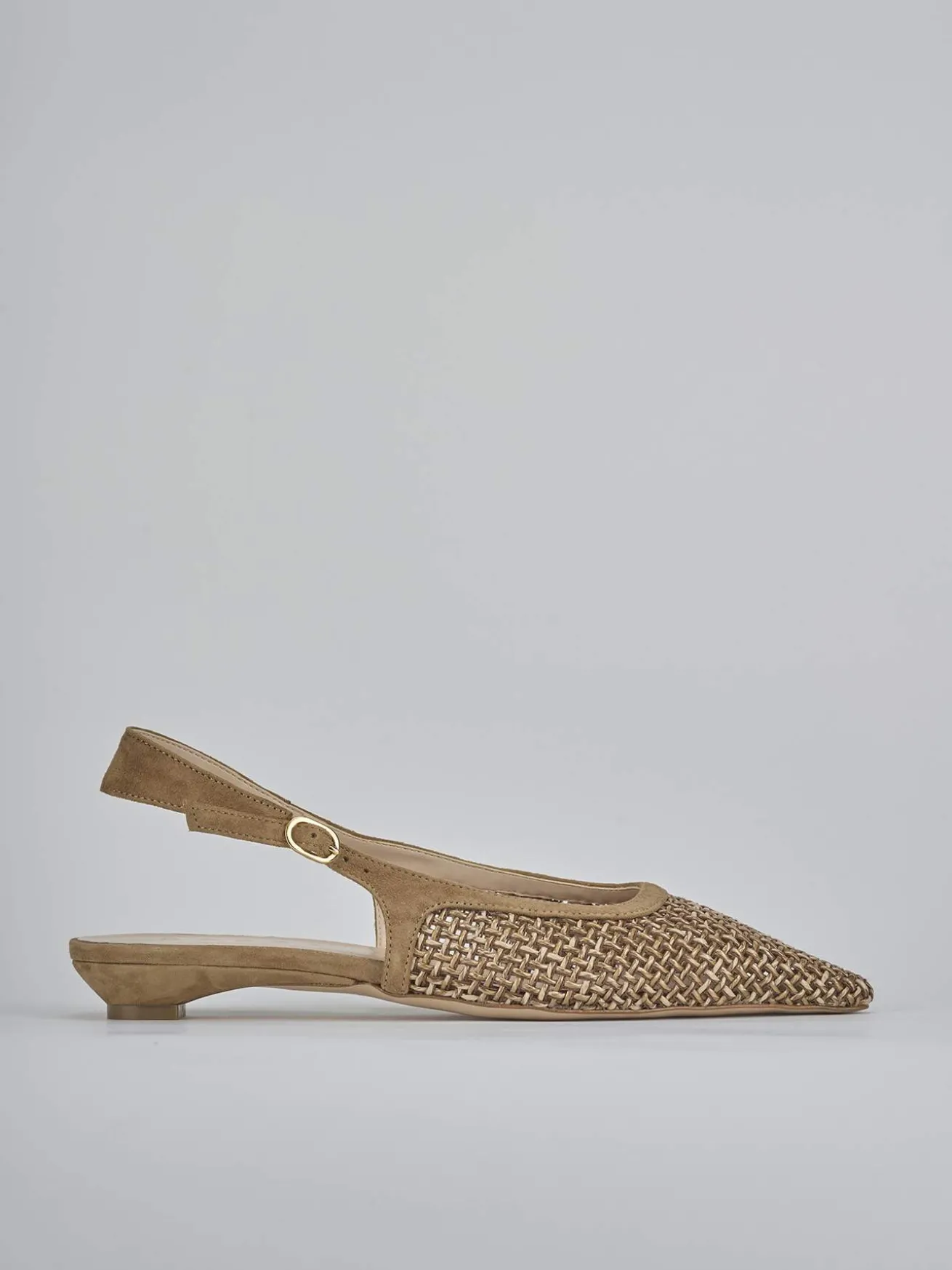 Ballerina tacco 2 cm fondo in leggerissima gomma e soletto interno in vera pelle. Tomaia in morbido camoscio foderata in tessuto juta, punta sfilata, scollo leggermente squadrato, bordo a rinforzo e cinturino con fibbia regolabile. Perfetto per qualsiasi occasione.