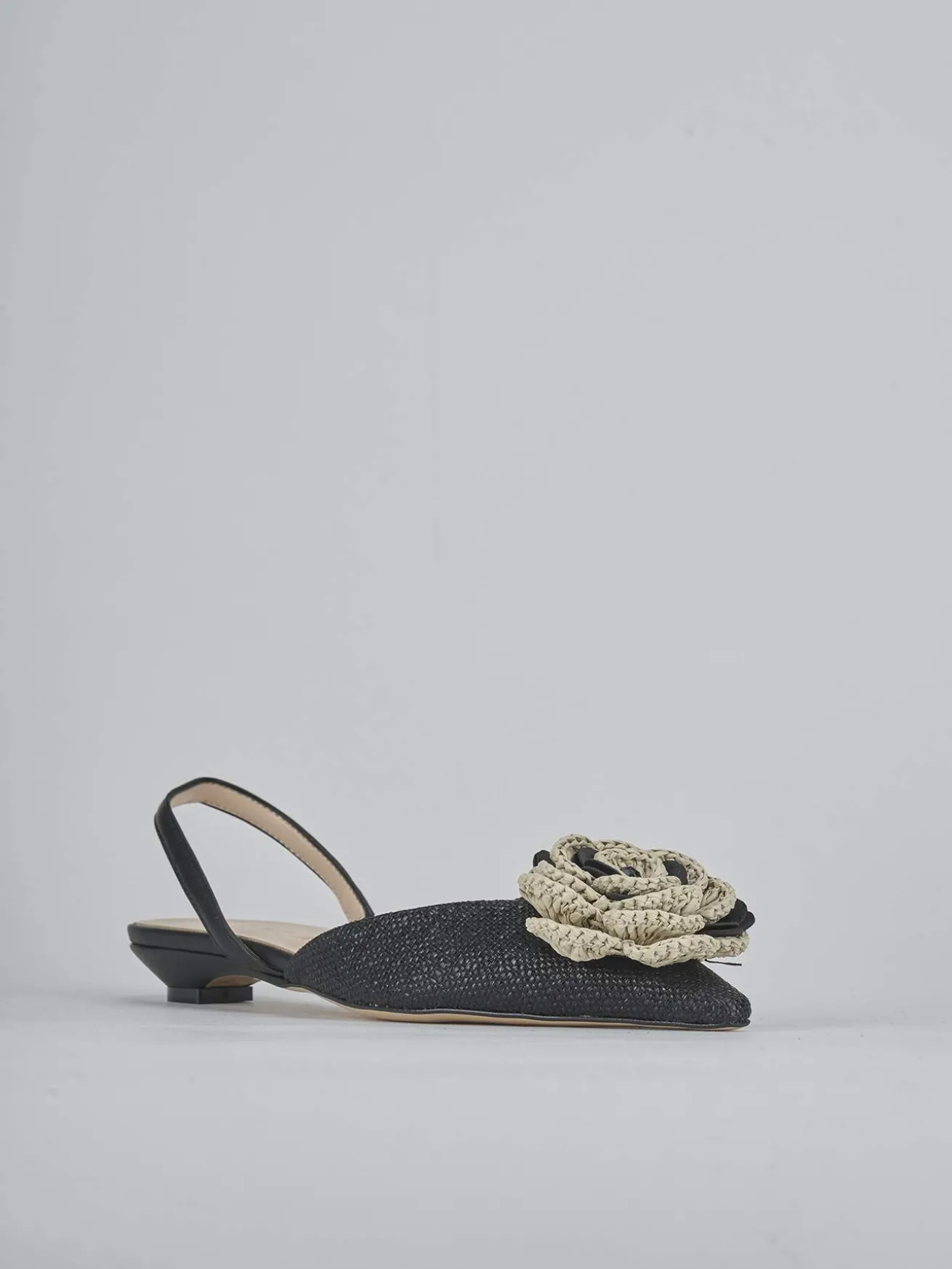 Ballerina tacco 2 cm fondo in leggerissima gomma e soletto interno in vera pelle. Tomaia in morbida pelle foderata di rafia, punta sfilata, scollo morbido a ‘U’, accessorio floreale, cinturino elasticizzato e tacco a cono stabile. Per le tue occasioni più speciali.