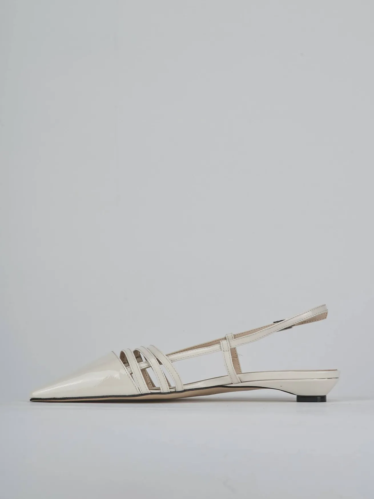Ballerina tacco 2 cm fondo in cuoio e soletto interno in vera pelle. Tomaia in morbida pelle effetto verniciato, punta sfilata, puntale, scollo lineare, tre cintuirni con fibbia regolabile e cinturino sul tallone per il massimo del comfort. Comodissimo tacco a cono per un look che ti farà notare.