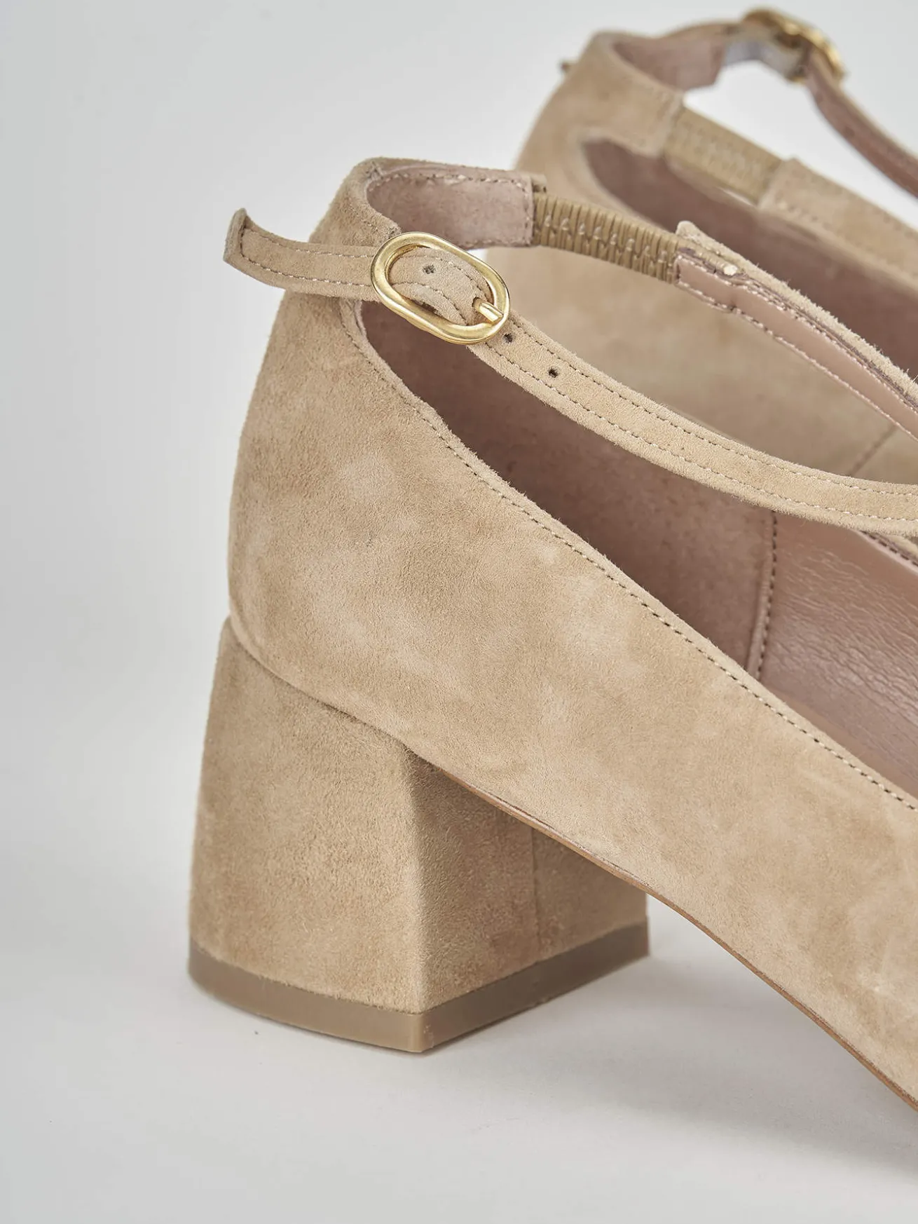 Bebè tacco 5 cm, fondo in cuoio e soletto interno in vera pelle. Tomaia in morbida pelle scamosciata, punta squadrata, cinturini che si incrociano sul collo del piede, chiusura a fibbia regolabile e tacco grosso per una calzata più comoda, adatto con un vestito per un look elegante.