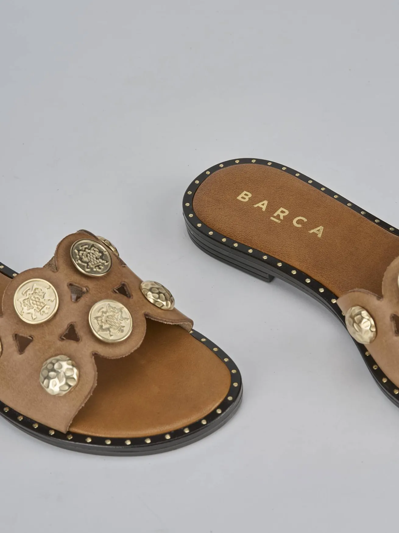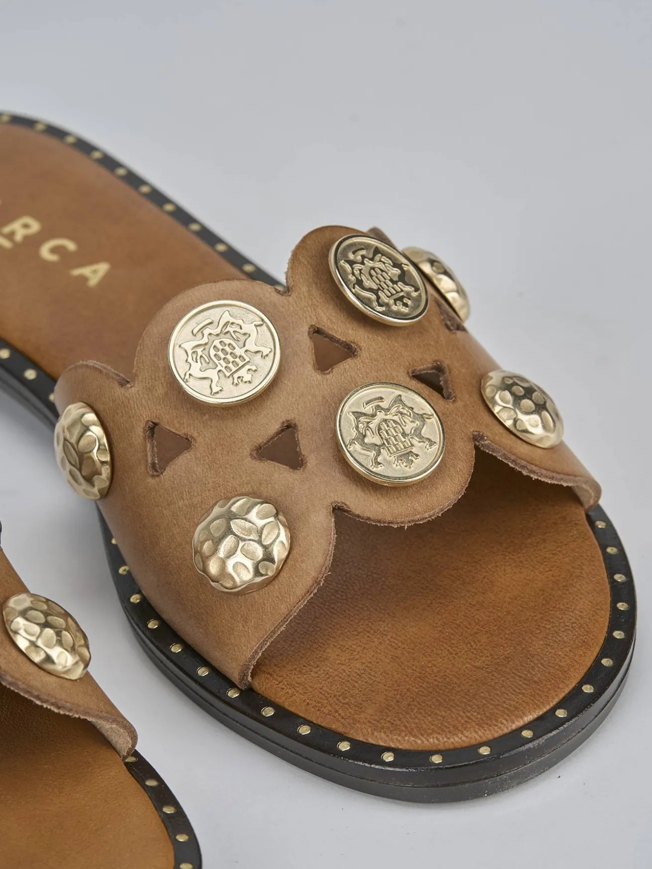 La tomaia in pelle morbida presenta una punta affusolata e una fascia unica decorata con eleganti medaglie, aggiungendo un tocco di raffinatezza al tuo look quotidiano.