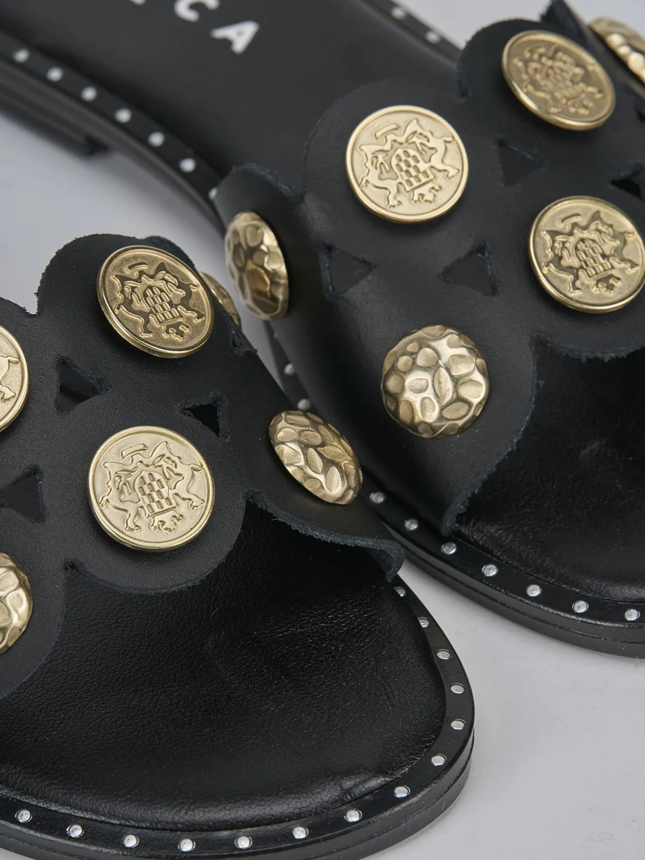 La tomaia presenta una fascia unica adornata con eleganti accessori a forma di medaglie, che aggiungono un tocco raffinato al design.