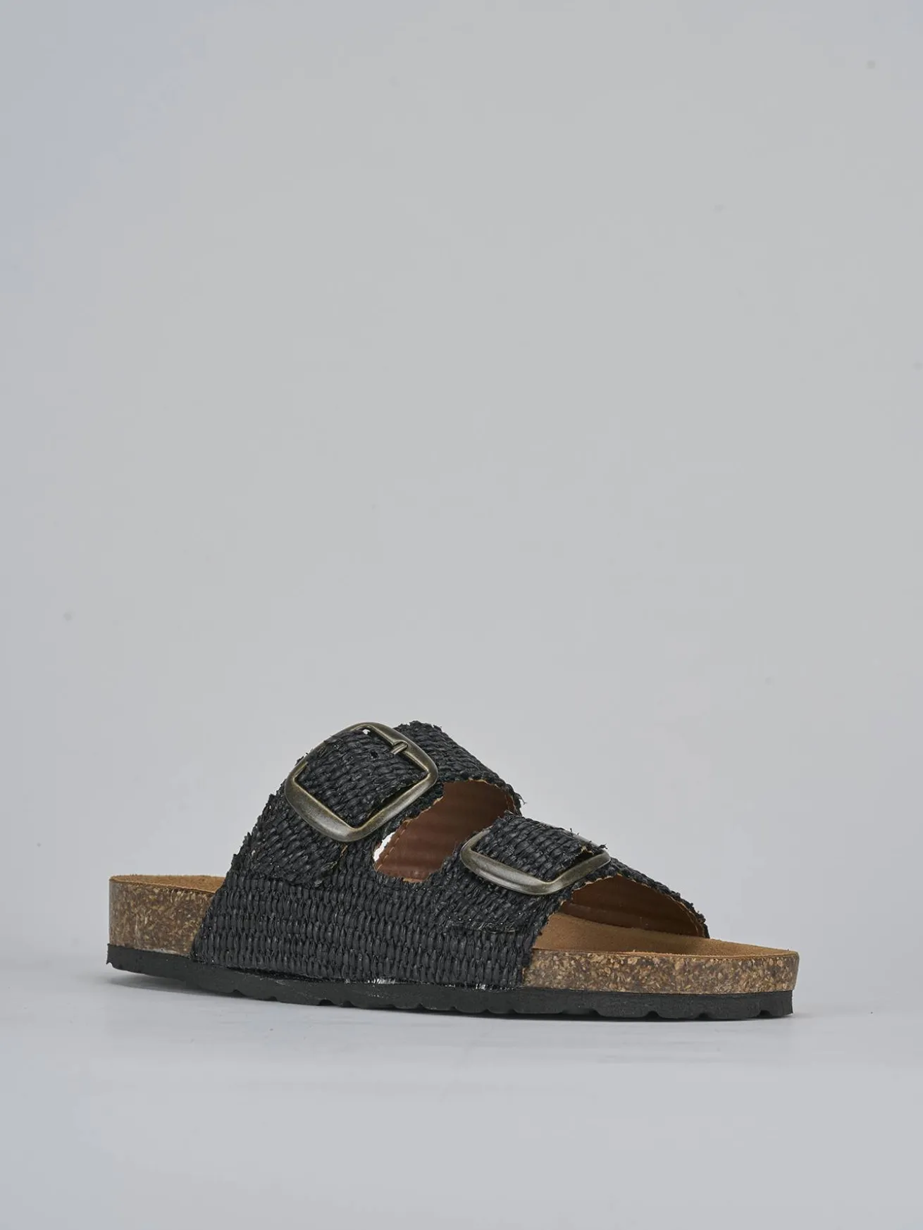 Realizzata in tessuto nero, questa ciabatta presenta un fondo in leggerissima gomma e un soletto interno in vera pelle, garantendo una comodità eccezionale per tutto il giorno.