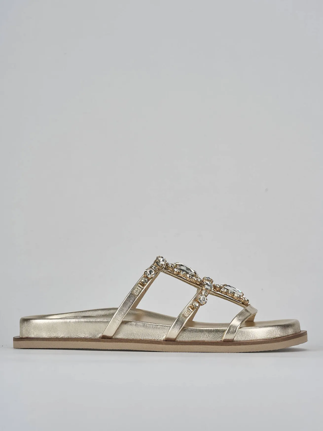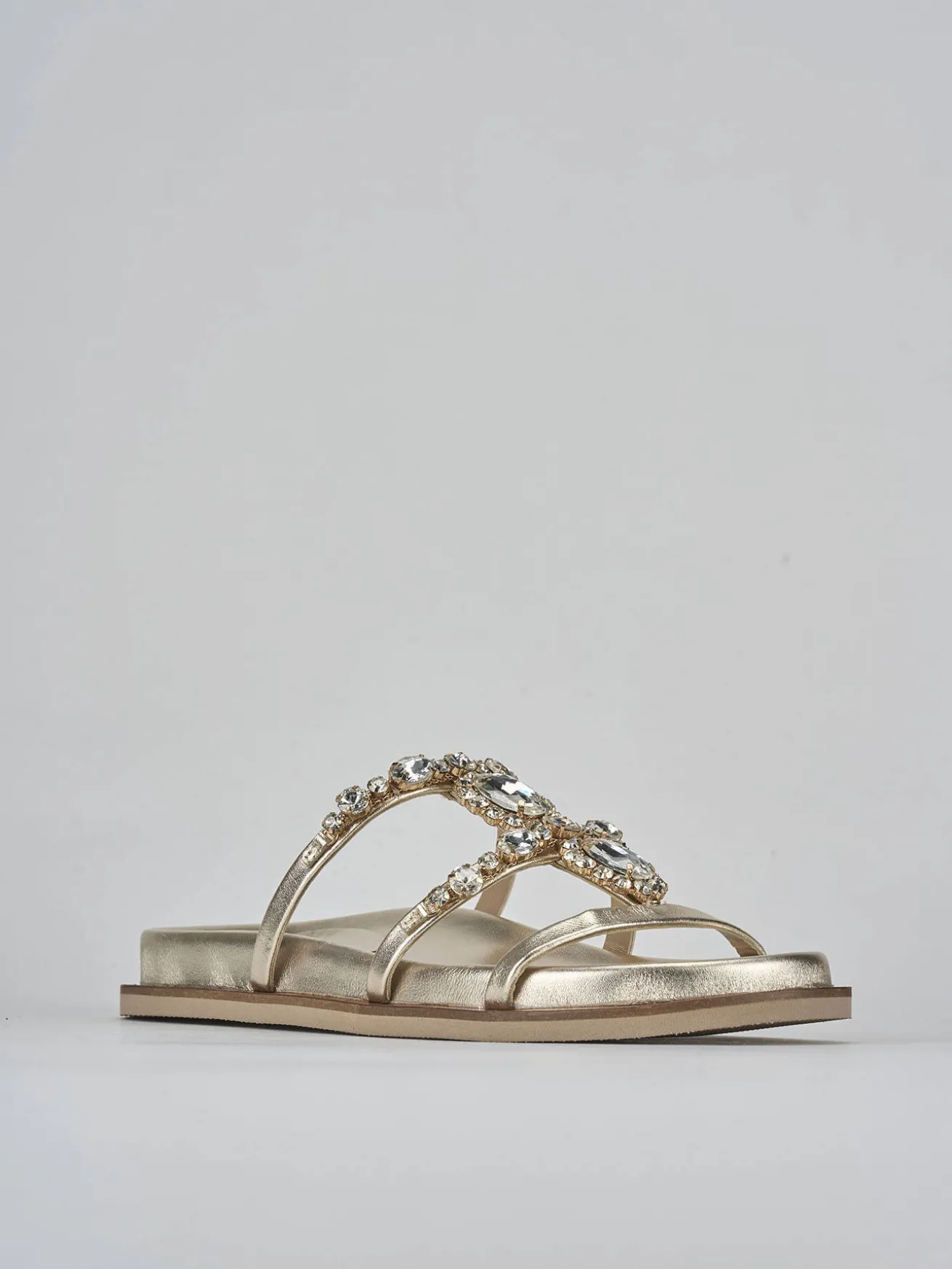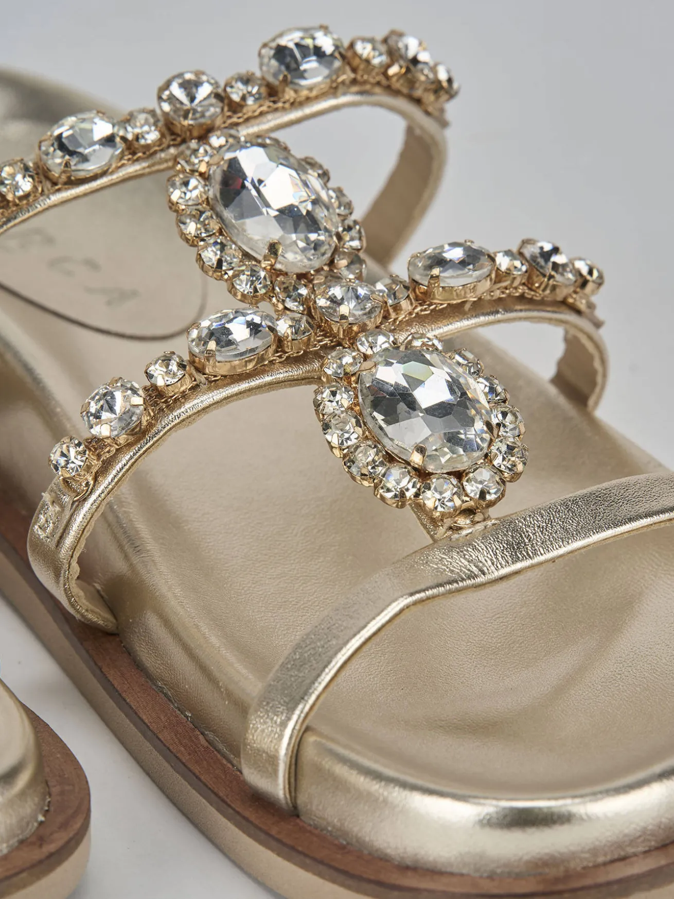 Realizzate in morbida pelle laminata, queste ciabatte presentano tre fascette mignon impreziosite da luminosissime pietre strass, che aggiungono un tocco di raffinatezza ad ogni passo.