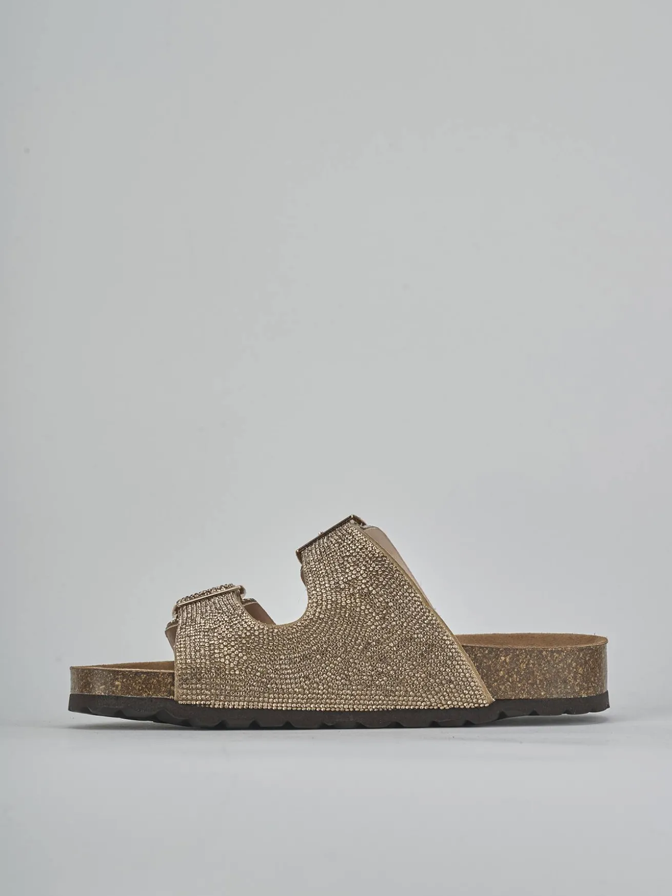 La tomaia è in morbida pelle, arricchita da due fasce con fibbia regolabile, impreziosite da eleganti strass.