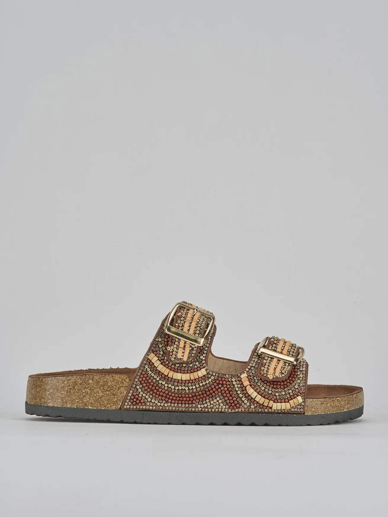 Realizzate in pelle bronzo, queste ciabatte presentano una lavorazione unica con mini borchie, strass e perline che aggiungono un tocco di raffinatezza.