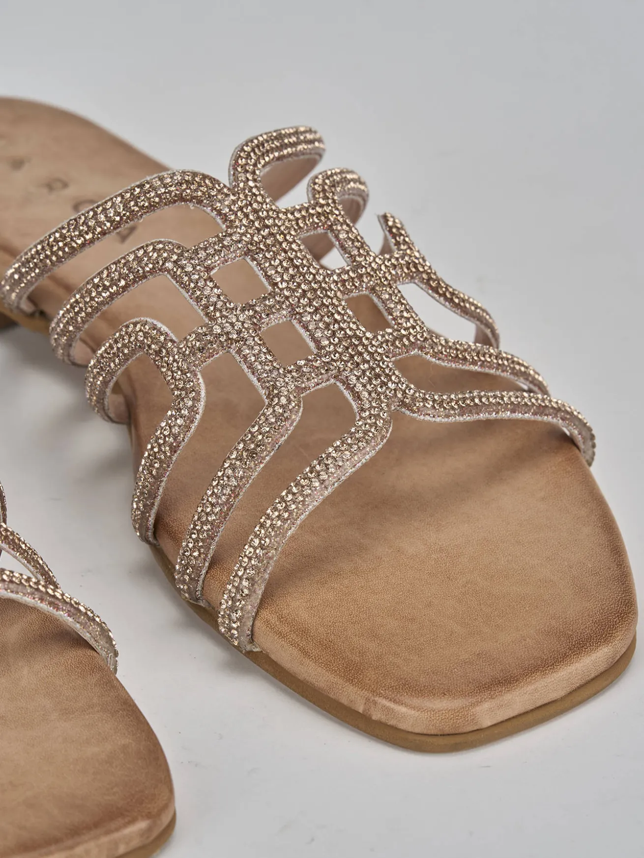 La tomaia è realizzata in morbida pelle, arricchita da minifascette intrecciate con applicazioni di strass che donano un tocco di brillantezza.