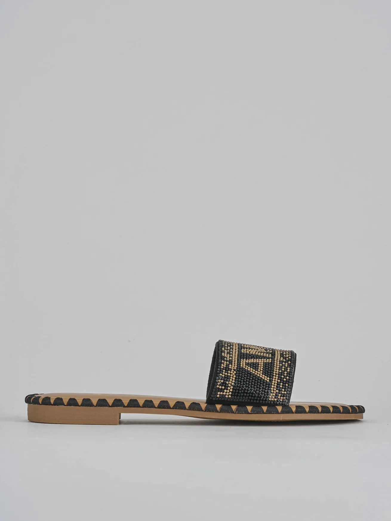 La tomaia è decorata da una fascia unica con miniborchie, perfetta per un look easy-chic, ideale per ogni occasione casual.