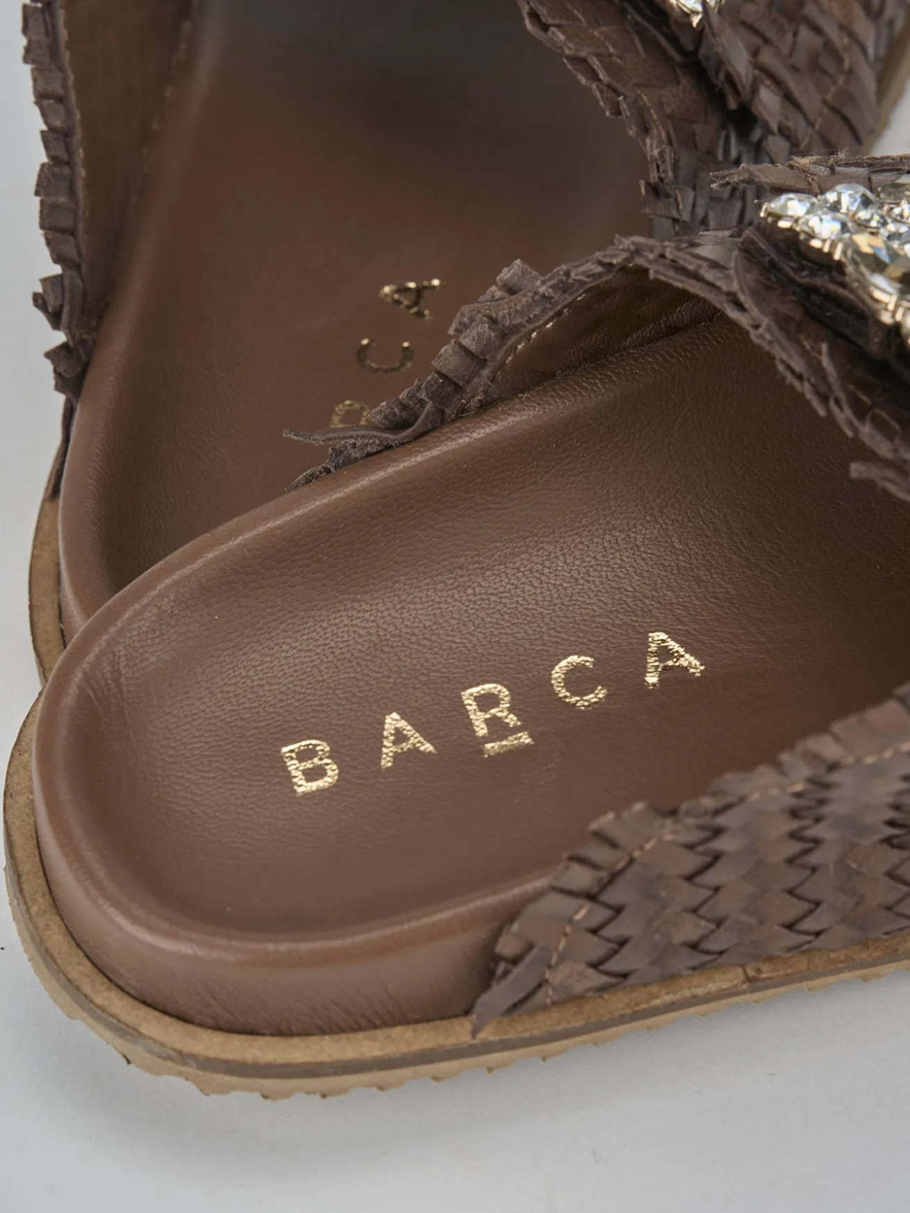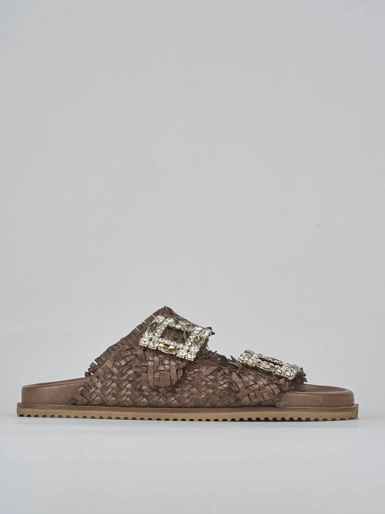 La tomaia è in morbida pelle finemente intrecciata, arricchita da due fasce con fibbie regolabili, che si adattano perfettamente al piede.