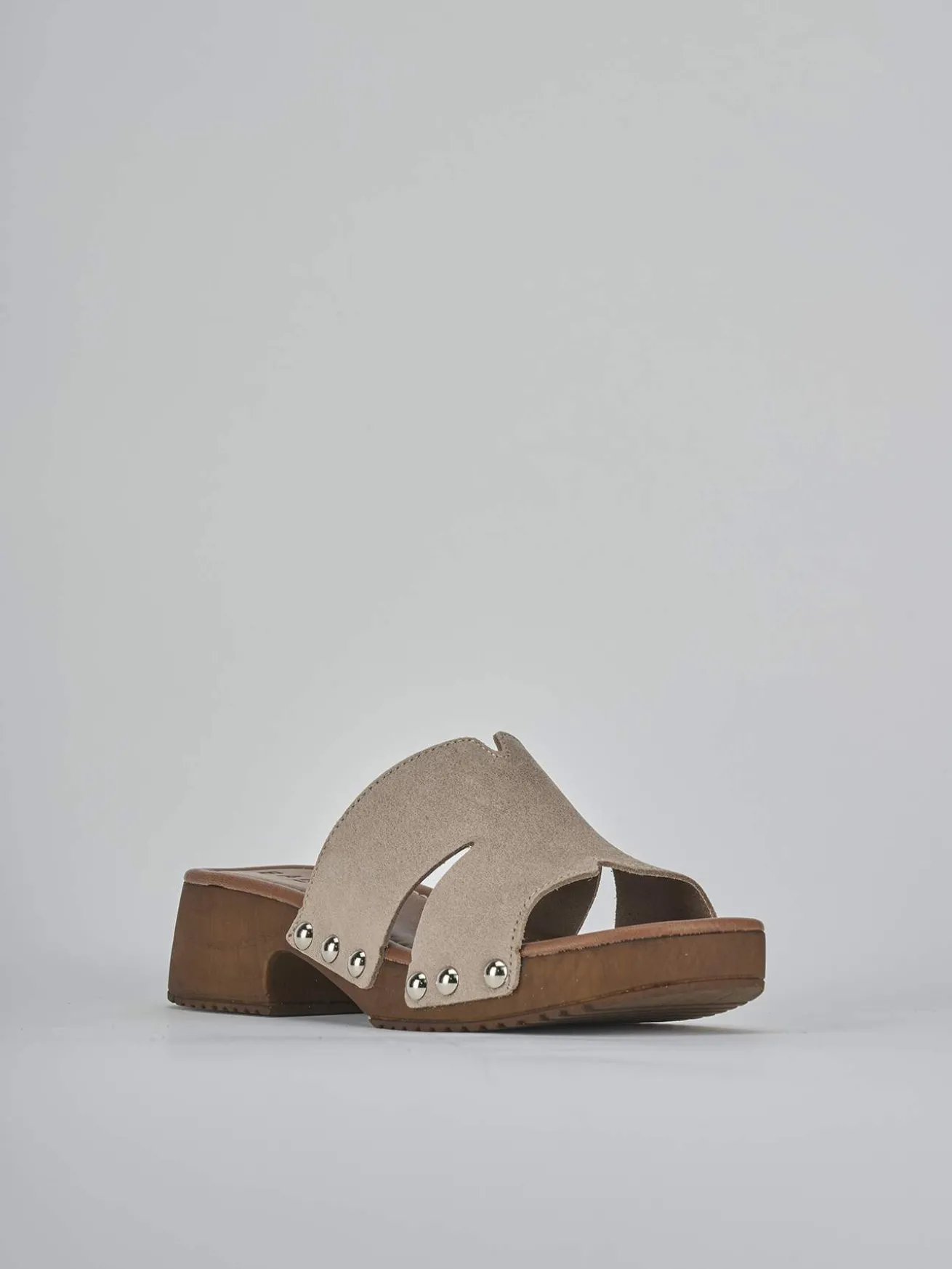 Ciabatta tacco 3 cm fondo in gomma e soletto interno in vera pelle. Tomaia in morbido camoscio, punta leggermente squadrata, cuciture a mano visibili, fascia unica centrale con taglio cool, piccole borchie sui bordi. Piccolo plateau anteriore di 1 cm e tacco stabile effetto legno per un look unico.
