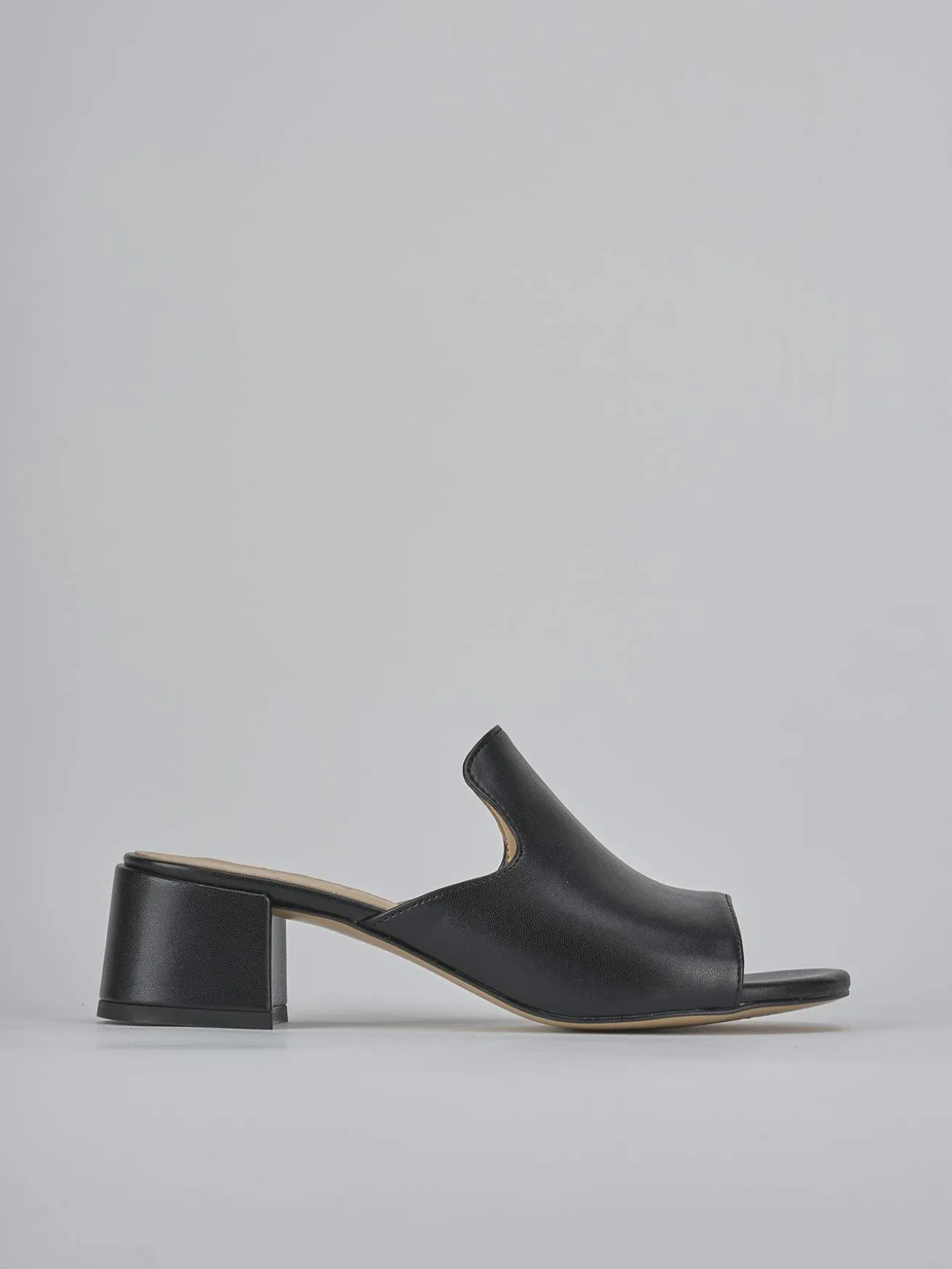 Ciabatta tacco 5 cm fondo in leggerissima gomma e soletto intero in vera pelle. Tomaia in morbida pelle, punta affusolata, fascia unica con frontalino leggermente rialzato e tacco grosso per un look cool.