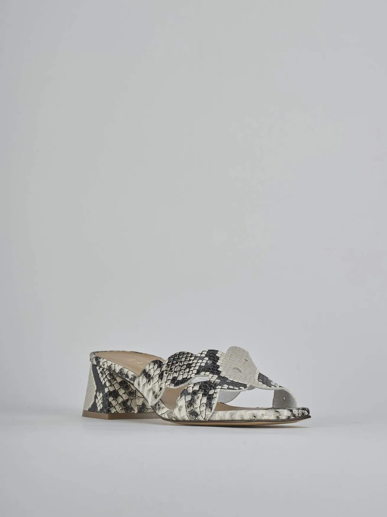 Ciabatta tacco 5 cm fondo in cuoio e soletto interno in vera pelle. Tomaia in morbida pelle con stampa pitonata, punta squadrata, fascia unica centrale con laseratura fori e comodo tacco grosso. Per un maggior comfort.