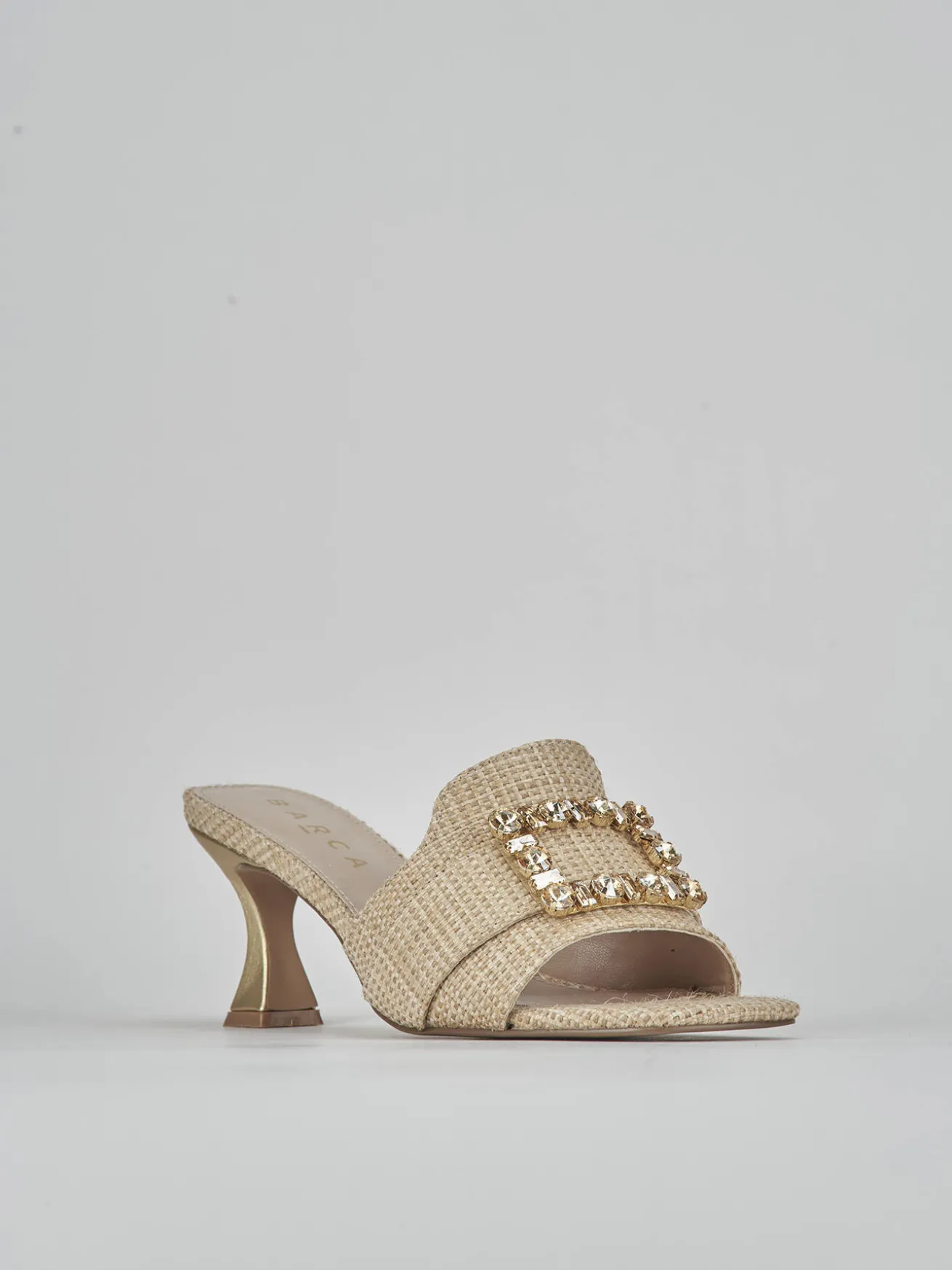 Ciabatta tacco 6 cm fondo in leggerissima gomma e soletto interno in vera pelle. tomaia in morbida pelle foderata da nuovissimo tessuto rafia in fantasia bicolor, punta squadrata, fascia unica, accessorio e tacco rocchetto per un look chic.