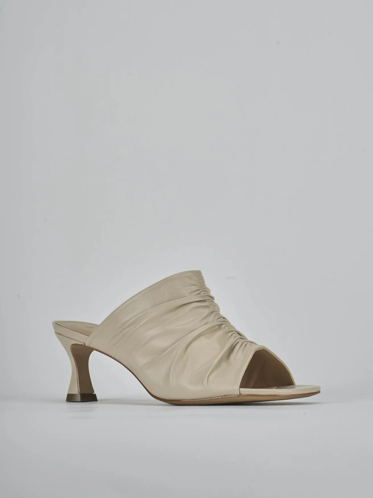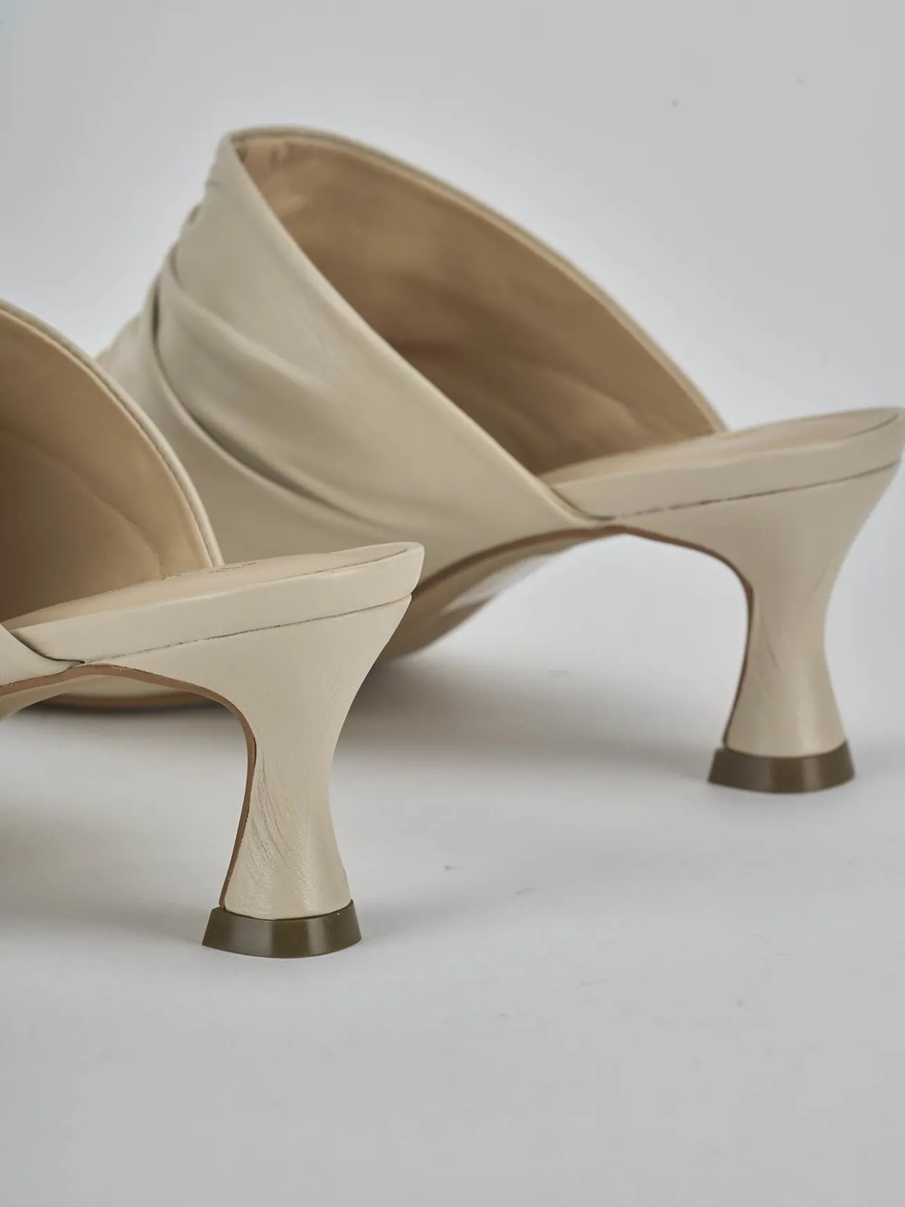Ciabatta tacco 6 cm fondo in leggerissima gomma e soletto interno in vera pelle. Tomaia in morbida pelle, punta leggermente squadrata, fascia unica con particolarissima arricciatura rimborsata e tacco rocchetto per un look che ti farà sicuramente notare.