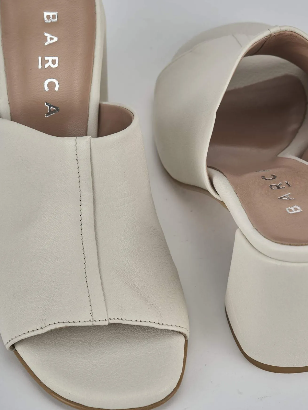 Ciabatta tacco 7 cm fondo in leggerissima gomma e soletto interno in vera pelle. Tomaia in morbida pelle, punta leggermente squadrata, fascia unica con cuciture a vista a mano e tacco grosso. Perfetto per la tua estate italiana.