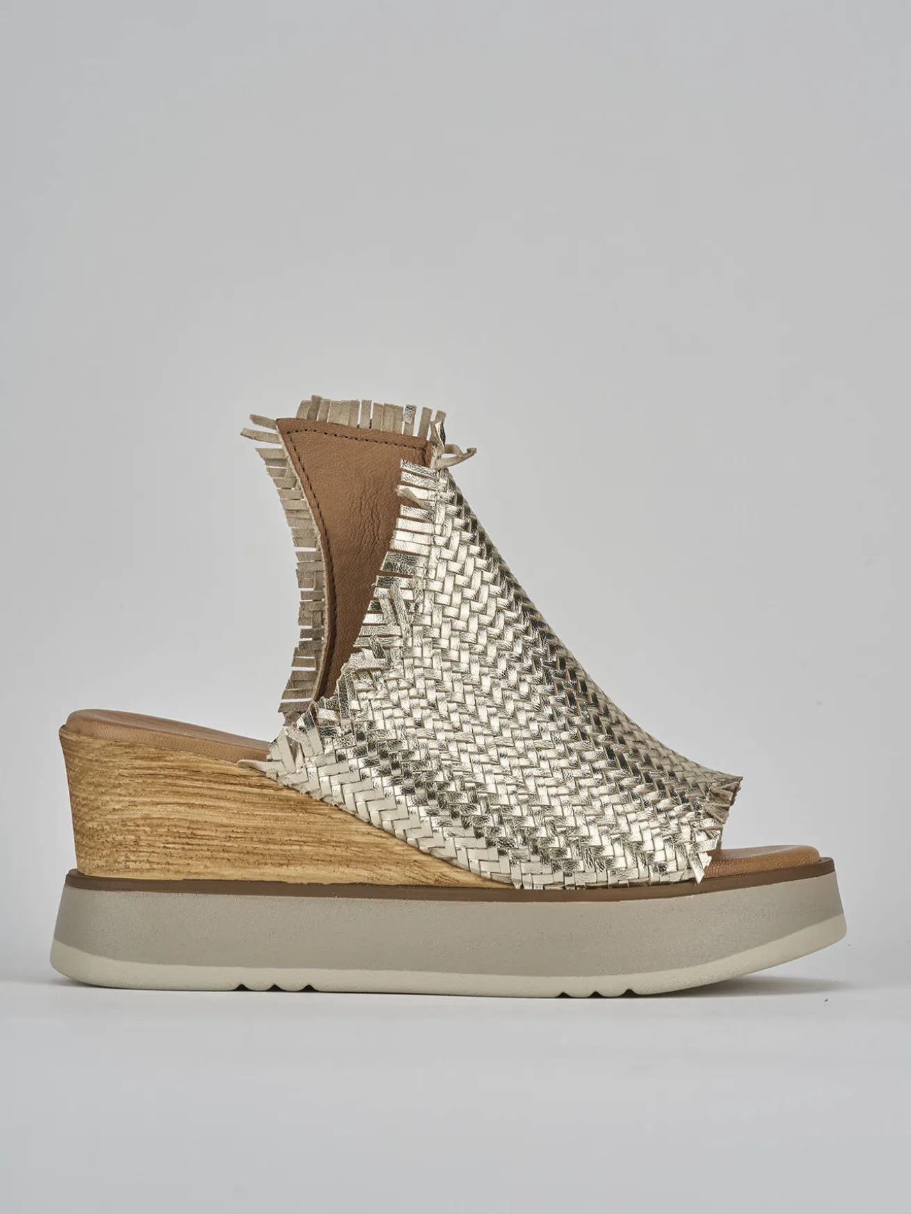 ciabatta zeppa 8 cm fondo in leggera gomma e soletto interno in vera pelle. tomaia in morbida pelle intrecciata, fascia unica con taglio svasato geometrico e plateau 3 cm davanti per un look cool.