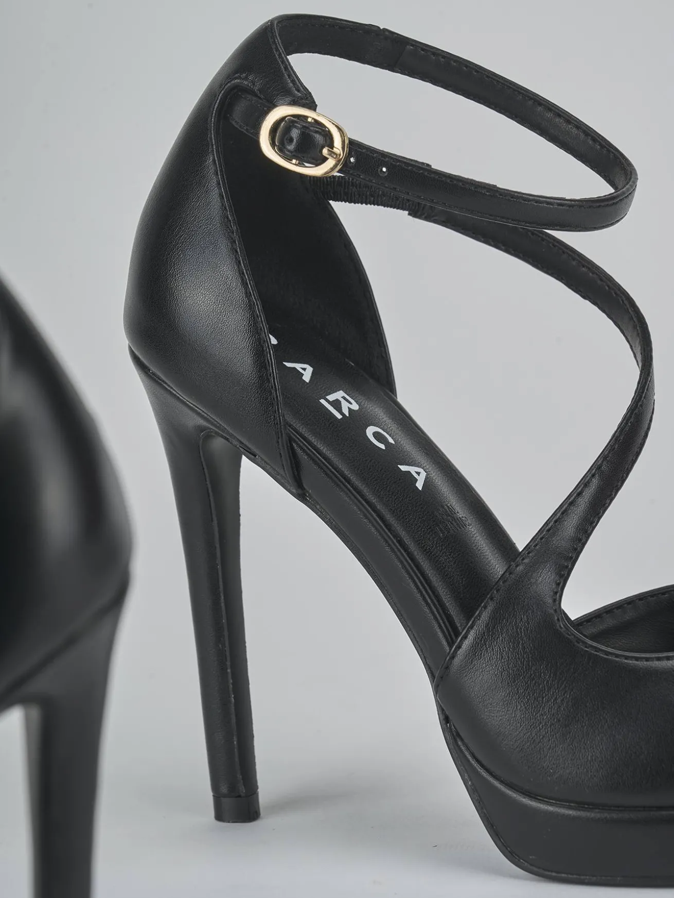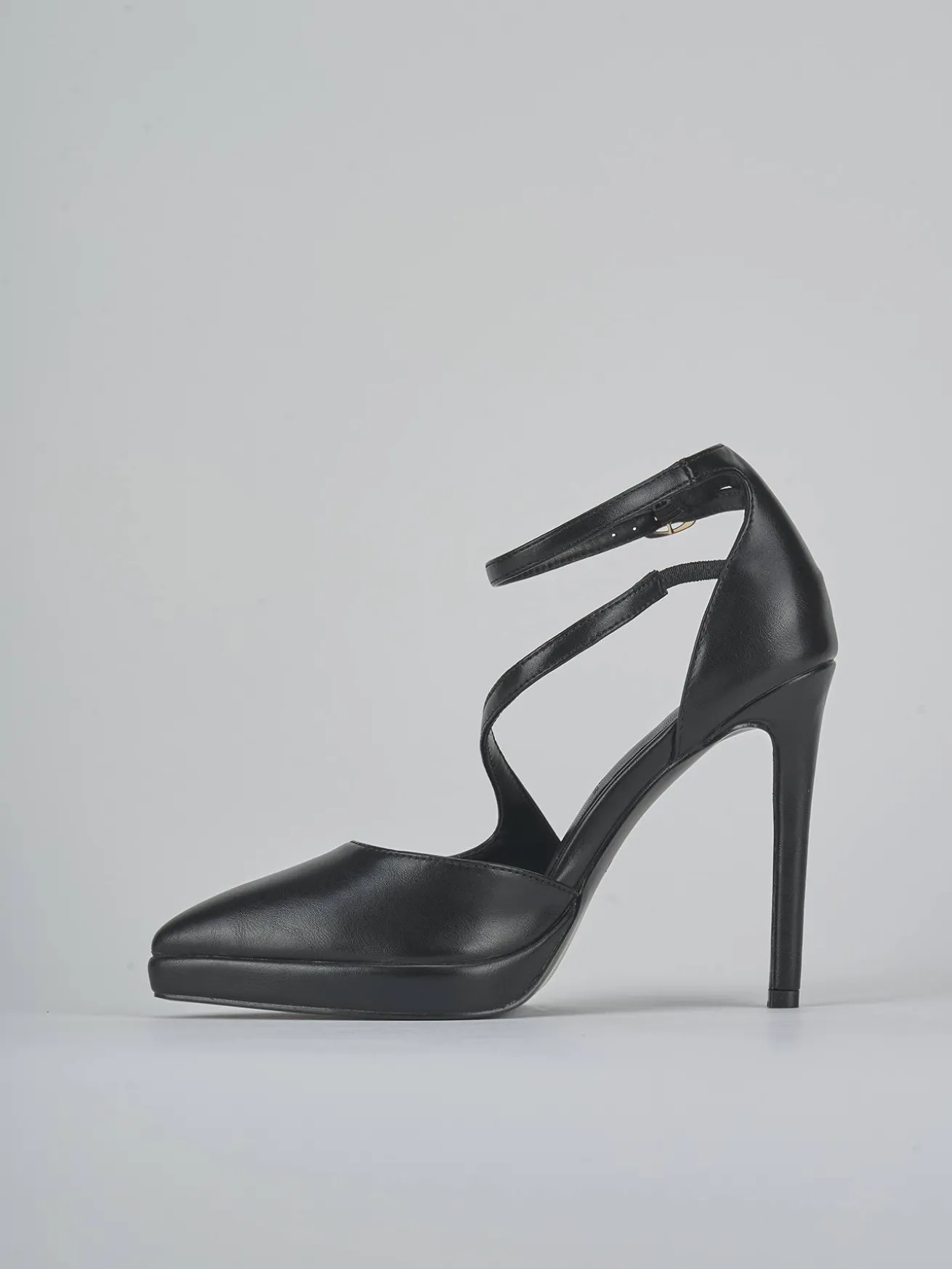 Realizzato in pelle sostenibile di colore nero, questo modello vanta un tacco di 10 cm che slancia la figura, mentre il piccolo plateau anteriore di 1 cm garantisce un comfort sorprendente.