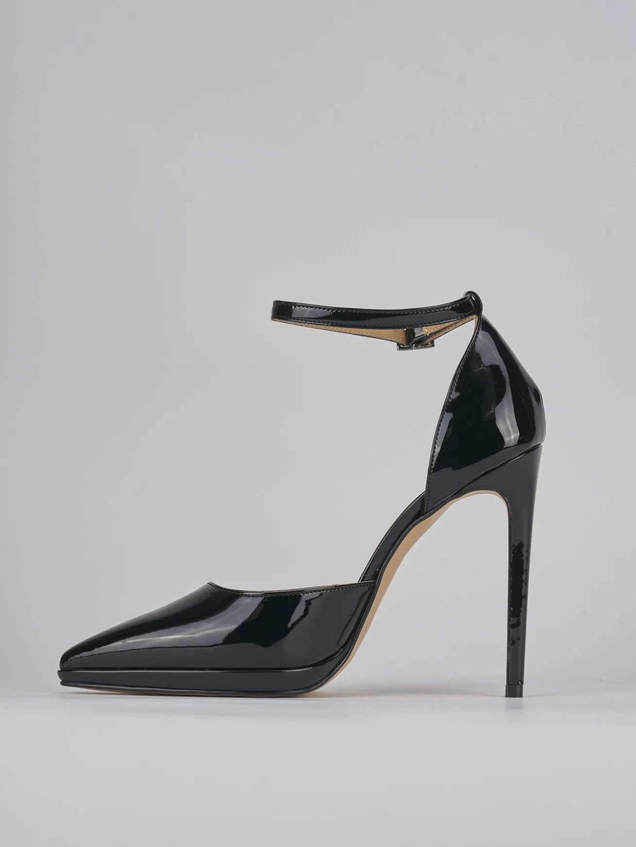 Bebè tacco 11 cm fondo in leggerissima gomma e soletto interno in vera pelle. Tomaia in morbida pelle effetto verniciato, punta sfilata, apertura svasata sulla punta, cinturino regolabile in caviglia, plateau di 1 cm e tacco fino per un look chic.