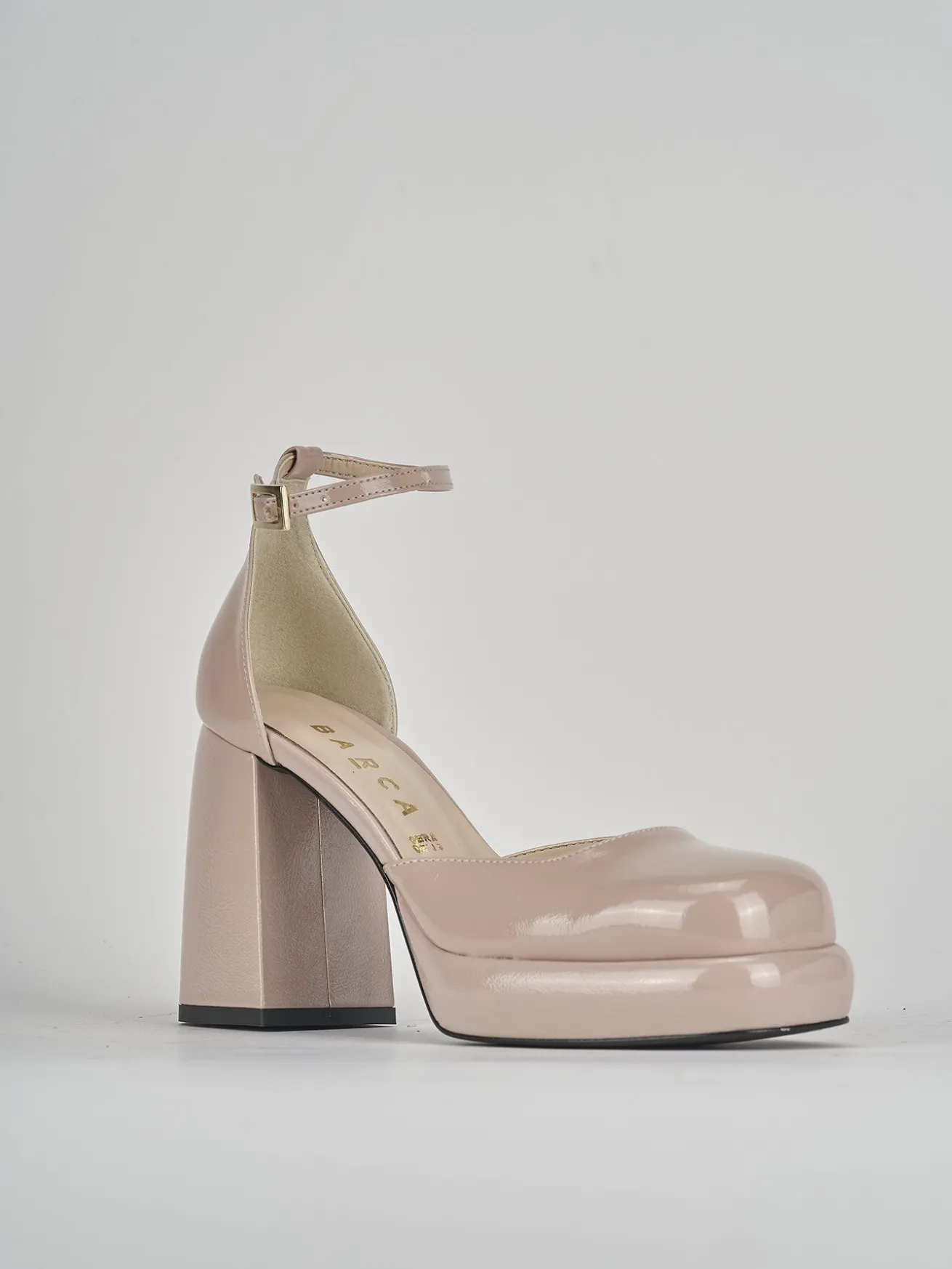 bebe’ tacco 11 cm fondo in gomma e soletto interno in vera pelle. tomaia in morbida pelle verniciata, punta squadrata, plateau anteriore alto 2cm, cinturino regolabile e tacco grosso per un look cool.