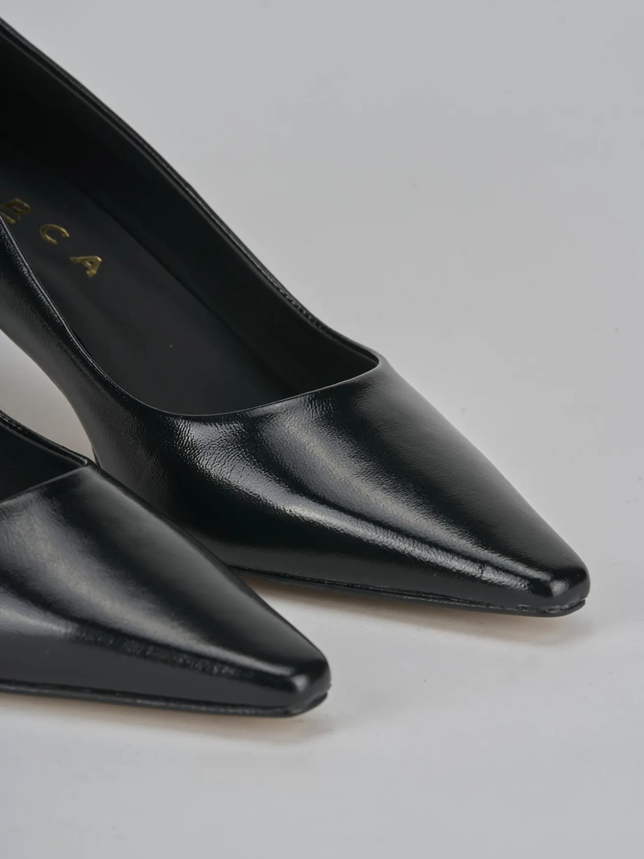 La tomaia in morbida pelle effetto verniciato dona un tocco di lucentezza, mentre la punta sfilata leggermente squadrata aggiunge un dettaglio moderno e chic.