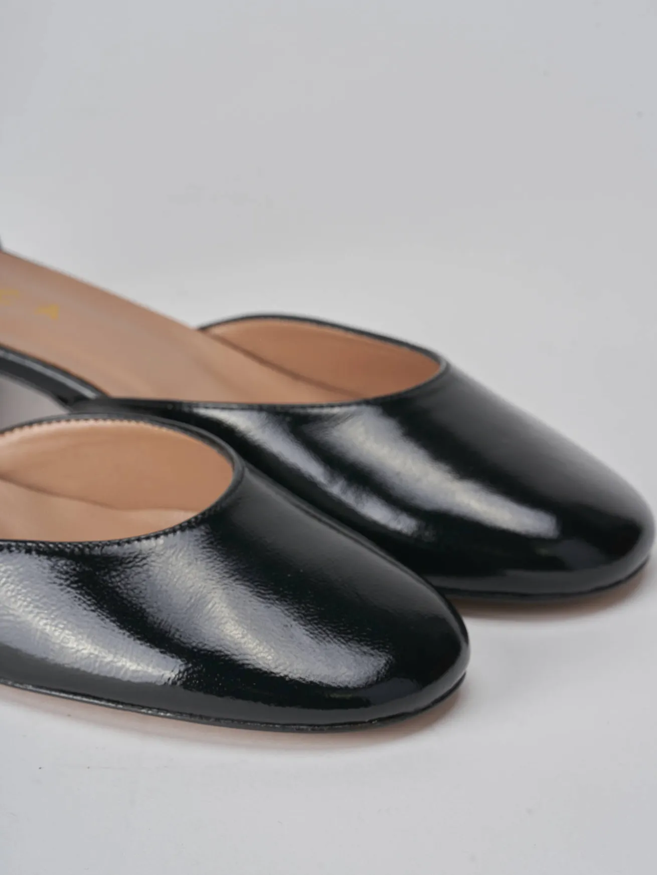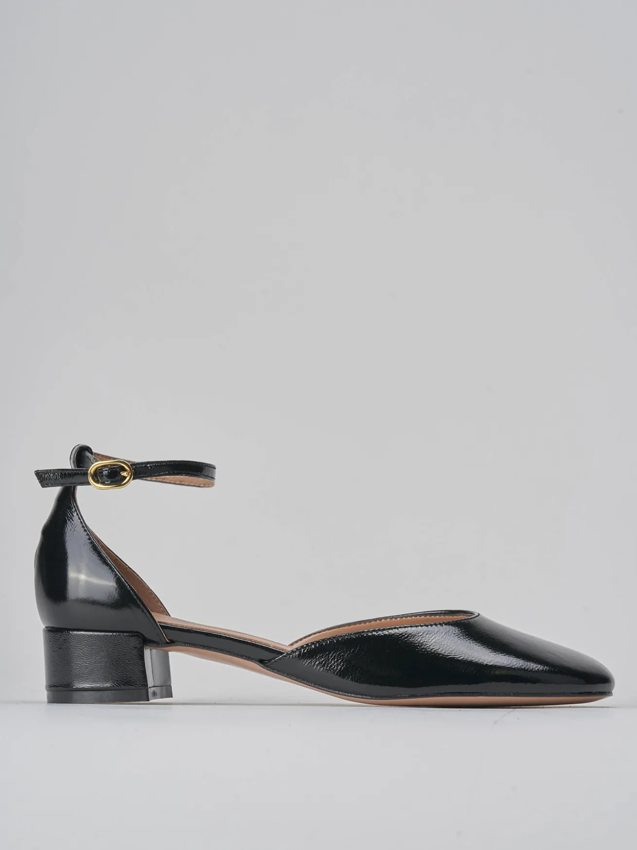 Bebe’ tacco 3 cm fondo in cuoio e soletto interno in vera pelle. tomaia in morbida pelle effetto verniciato, punta tonda, scollo a ‘U’ profondo, cinturino in caviglia con fibbia regolabile e tacco solido per un look cool.