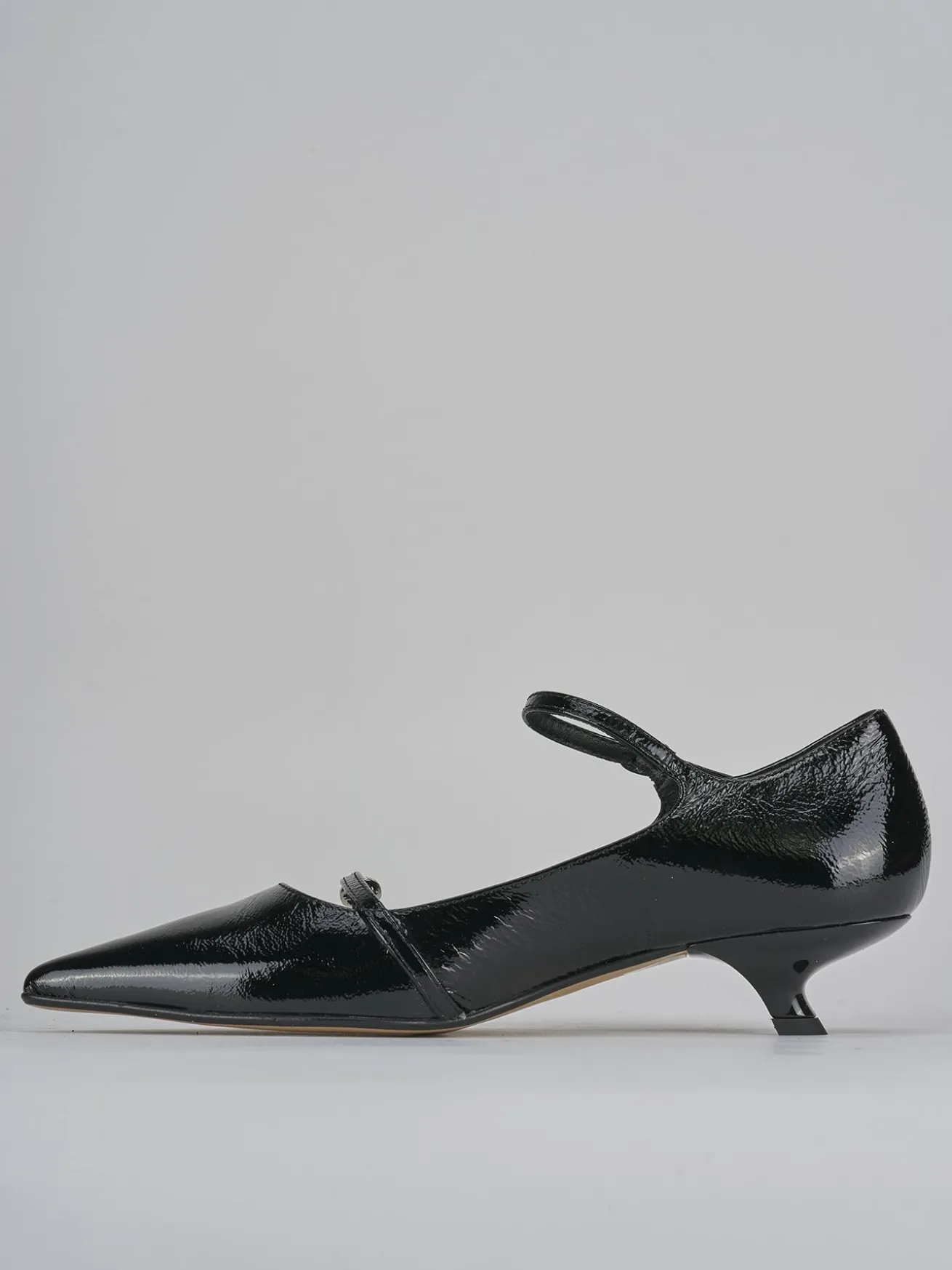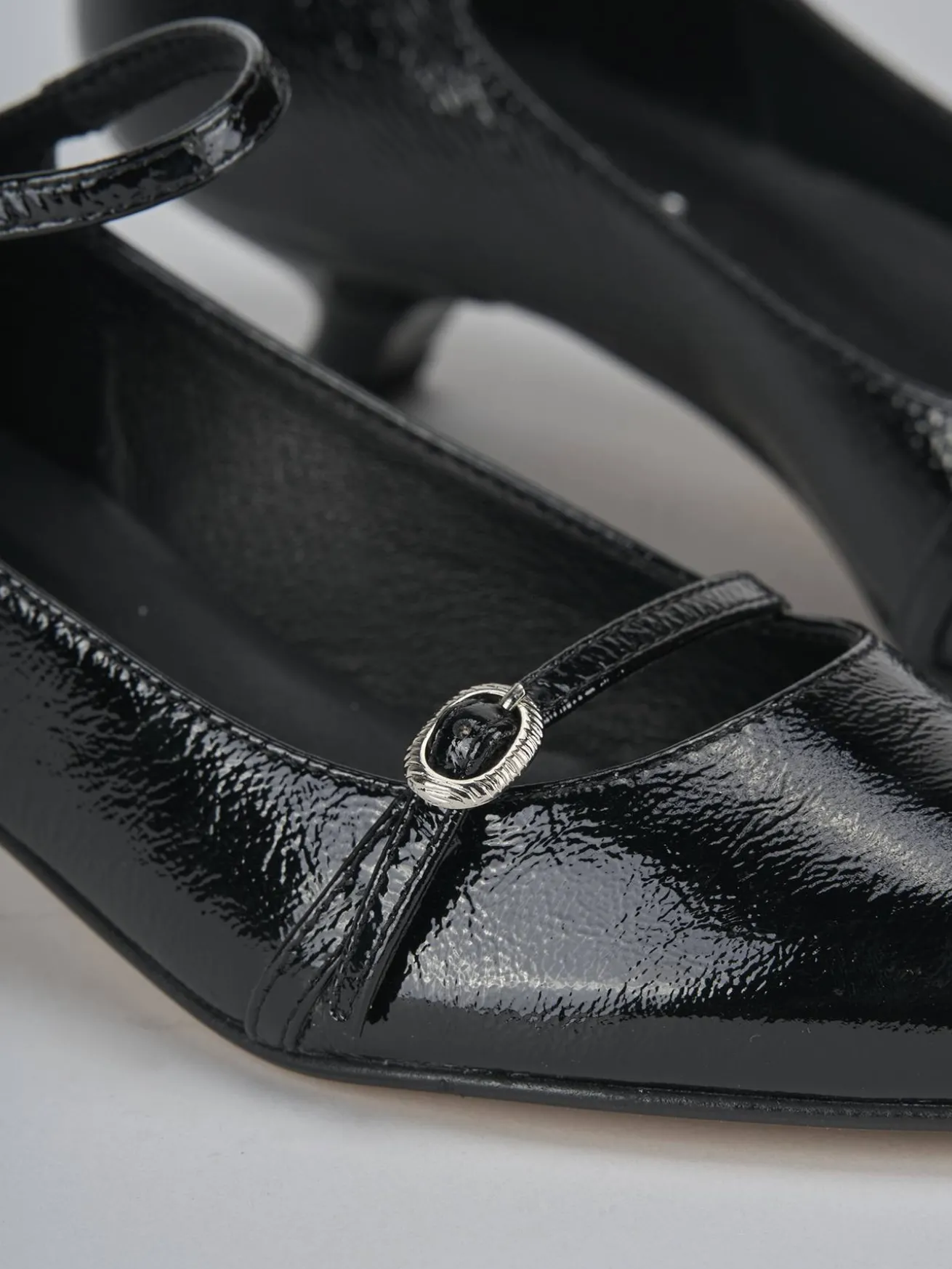 La tomaia in morbida pelle effetto verniciato dona un aspetto lucido e raffinato, mentre la punta sfilata e lo scollo dolce a ‘U’ esaltano la femminilità della scarpa.