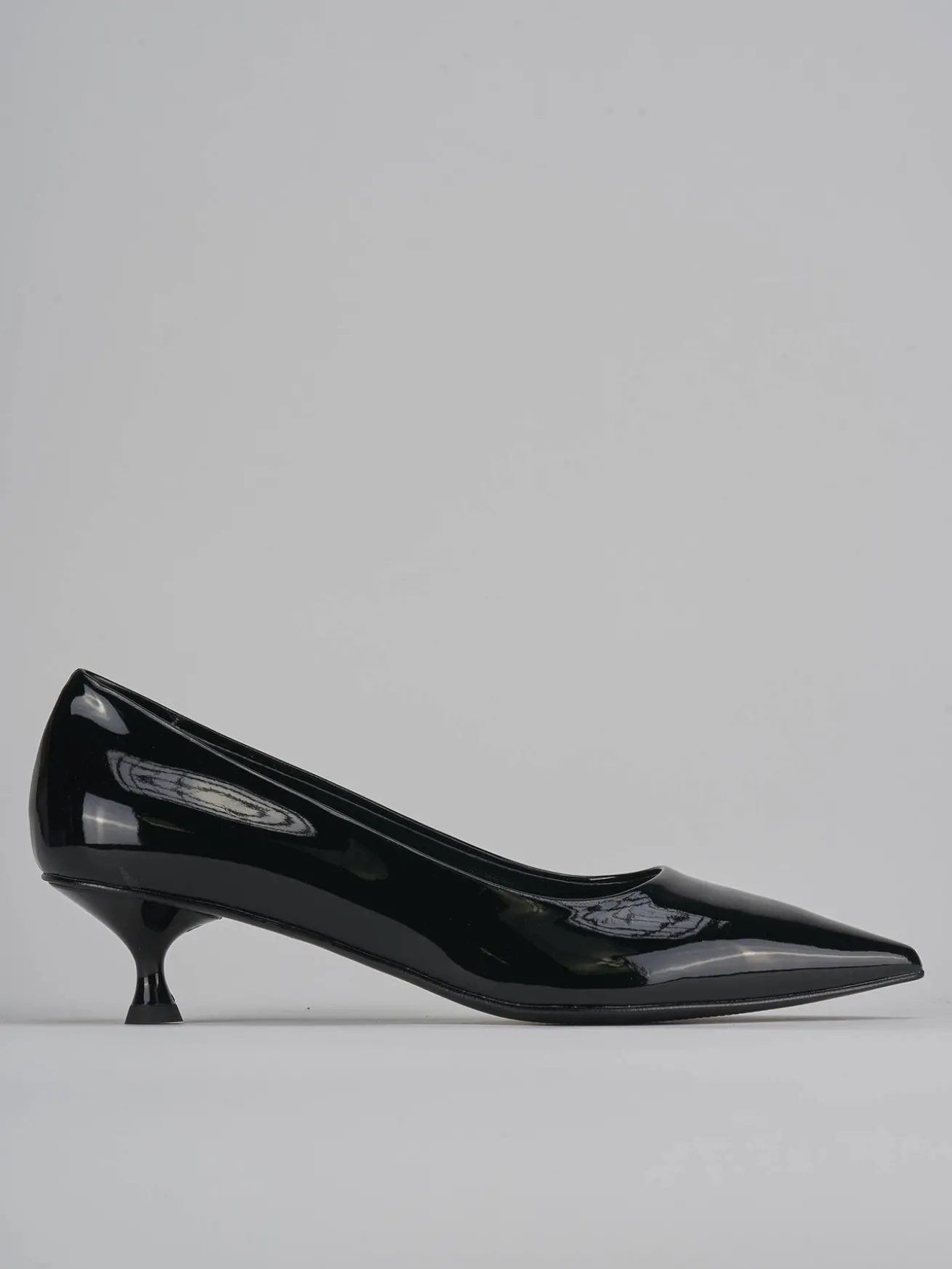decolte’ tacco 4 cm fondo in gomma e soletto interno in vera pelle. tomaia in morbida pelle effetto verniciato, punta sfilata, apertura svasata sulla punta e tacco rocchetto. design classico che non passa mai di moda.