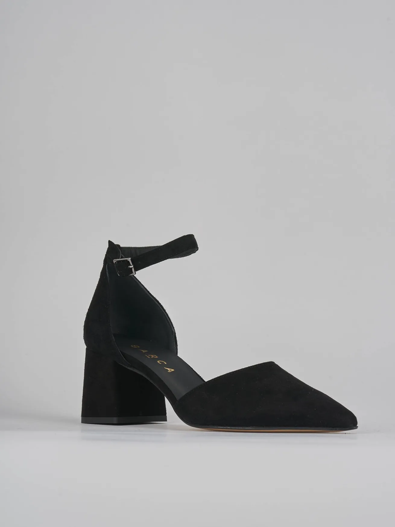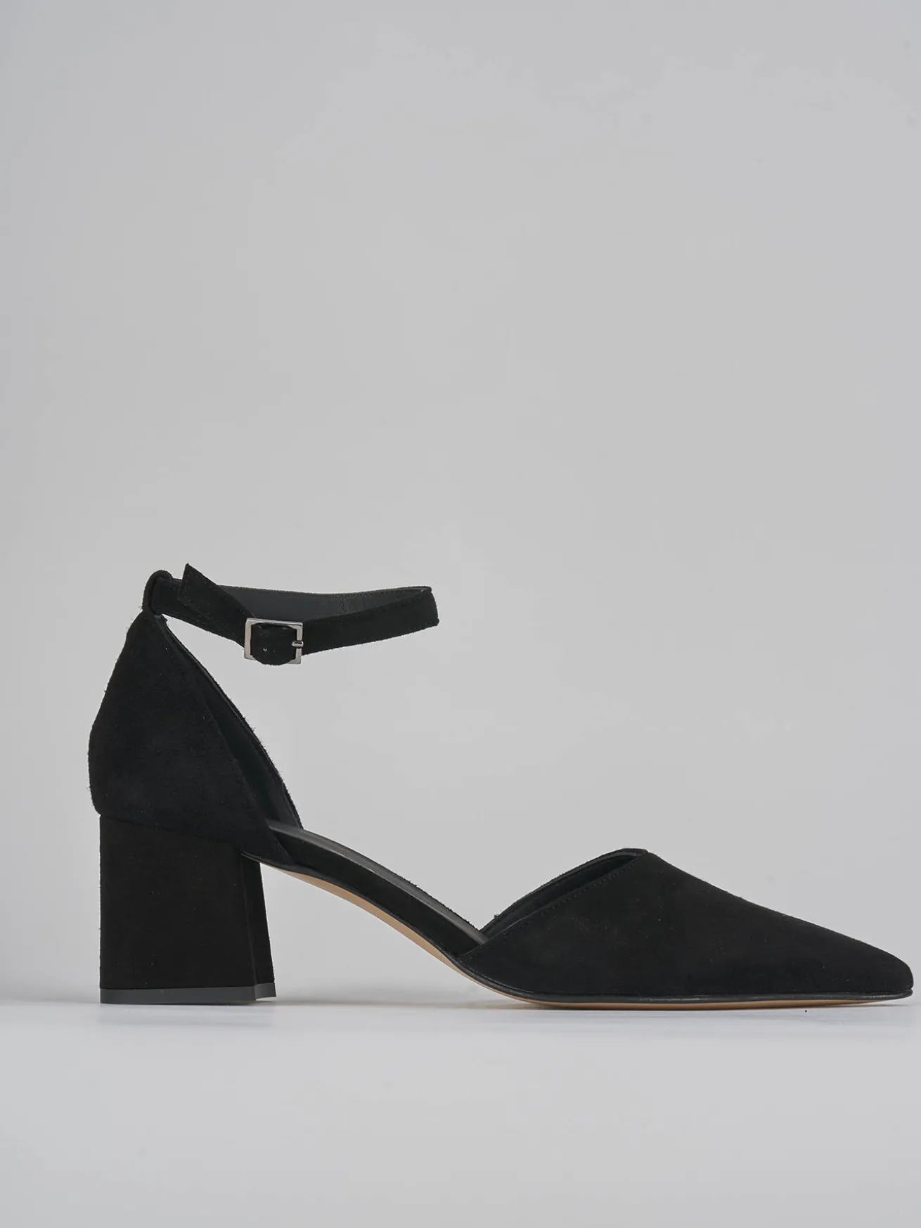 Bebè tacco 5 cm fondo in leggera gomma e soletto interno in vera pelle. Tomaia in morbido camoscio, punta sfilata, cinturino regolabile in caviglia, tallone chiuso e tacco grosso. dalle linee definite ed essenziali, perfetto con qualsiasi tuo outfit.