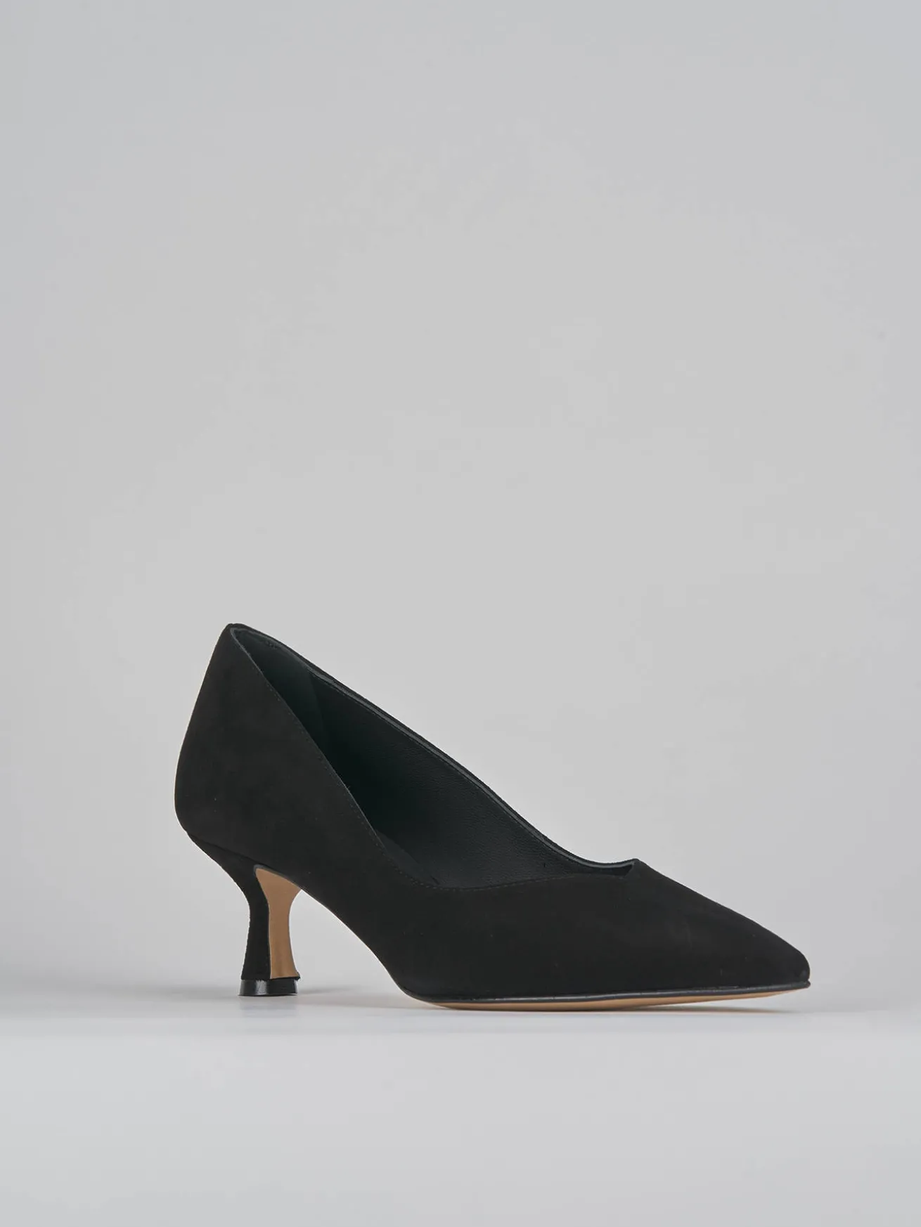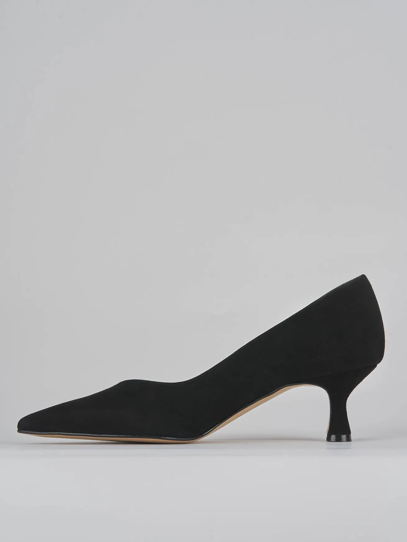 Decoltè tacco 5 cm fondo in cuoio e soletto interno in vera pelle. Tomaia in morbido camoscio, punta sfilata, apertura a “V” sul collo del piede e tacco rocchetto. dalle linee classiche che duranno nel tempo.