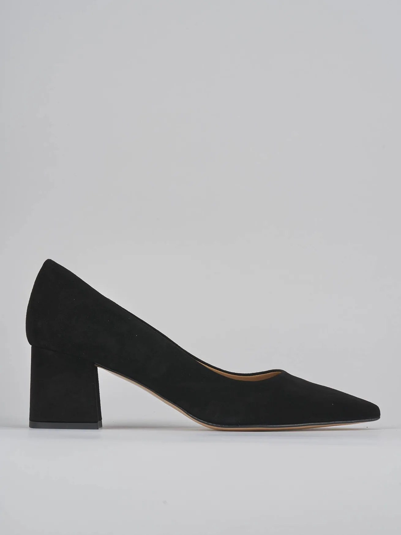 Decoltè tacco 5 cm fondo in cuoio e soletto interno in vera pelle. Tomaia in morbido camoscio, punta sfilata, apertura svasata sulla punta del piede e tacco grosso. dalla linee semplici per un look che non passa mai di moda.