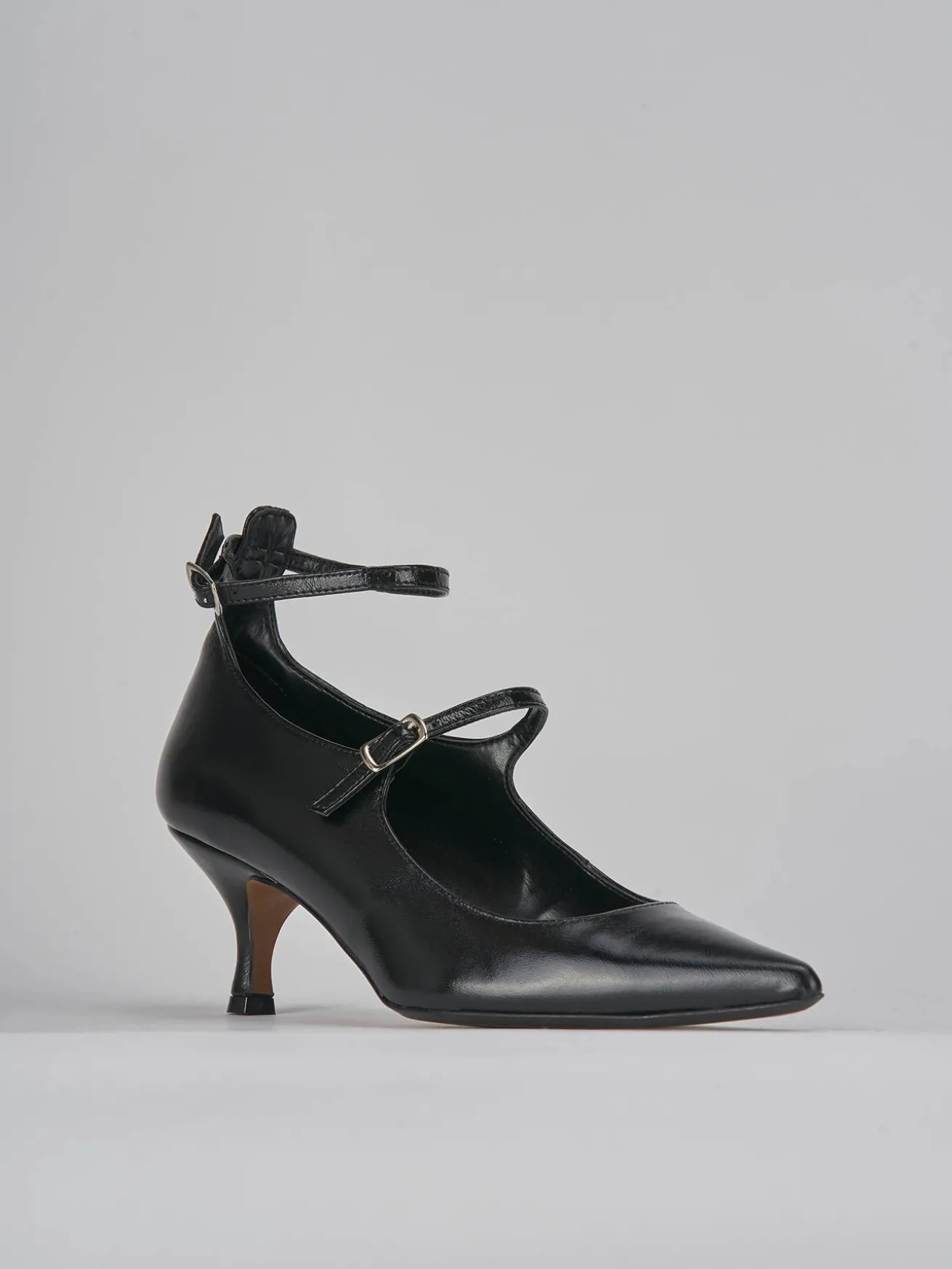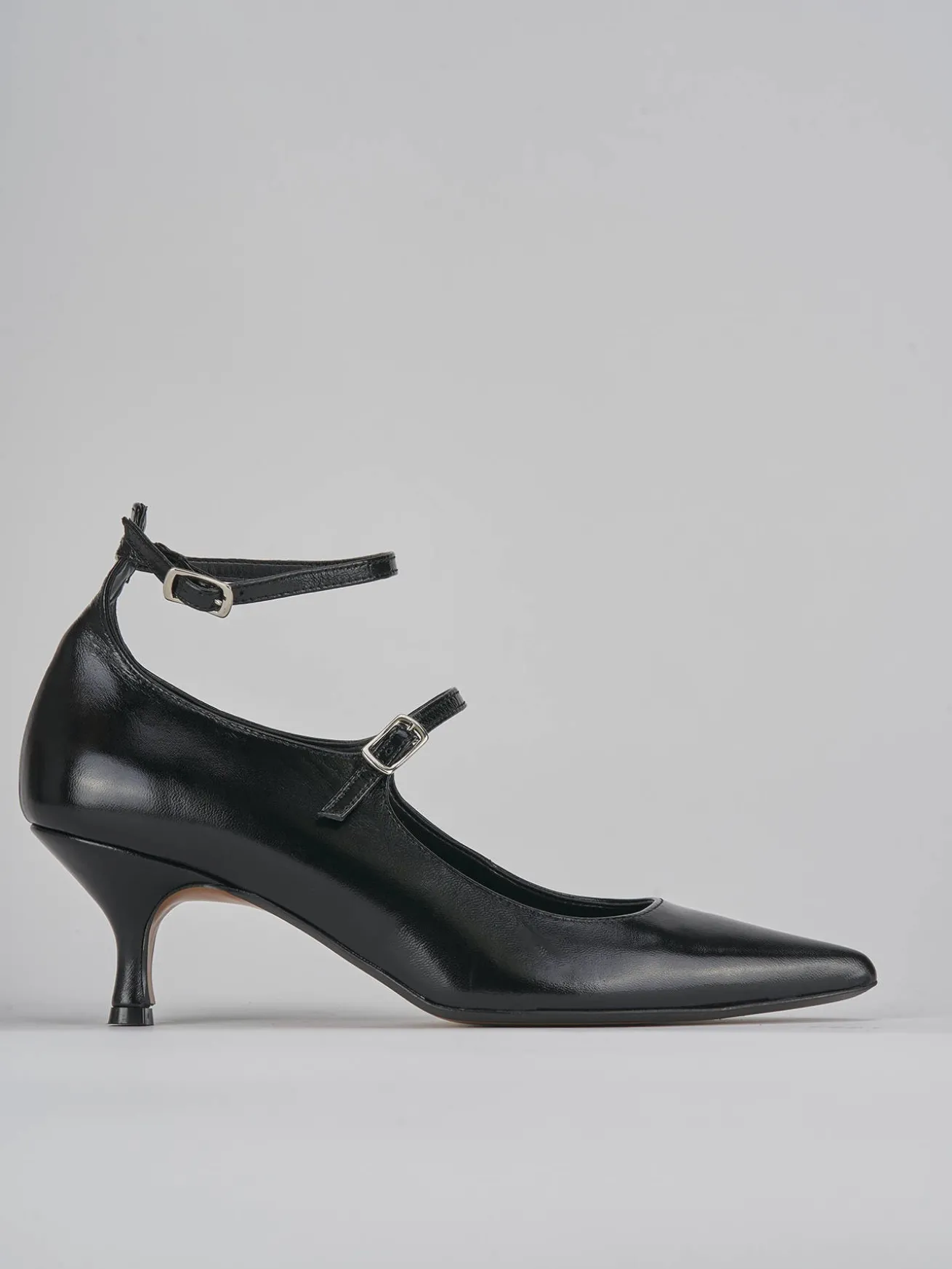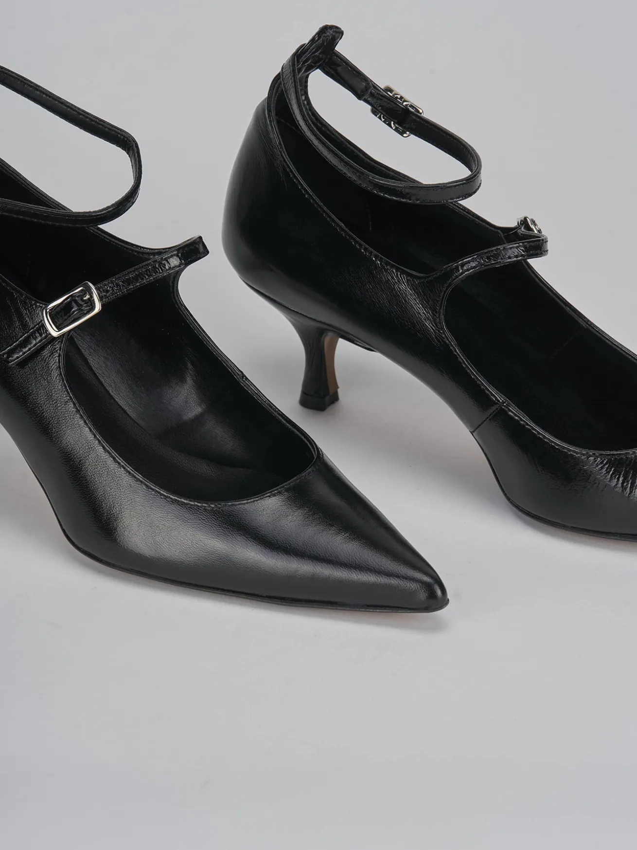 Bebè tacco 5 cm fondo in gomma e soletto interno in vera pelle. Tomaia in morbida pelle effetto verniciato, punta sfilata, doppio cinturino regolabile e comodo tacco rocchetto. perfetto con una gonna di jeans e un maglione.