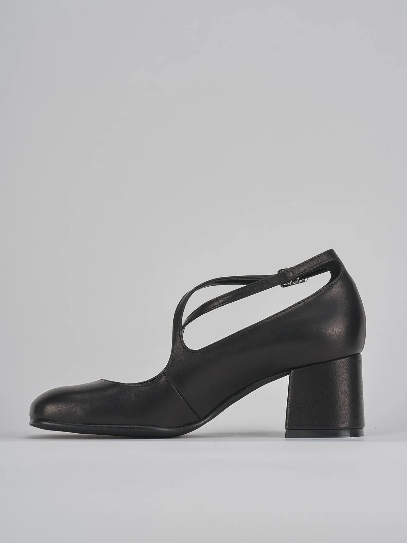 Bebè tacco 5 cm fondo in gomma e soletto interno in vera pelle. Tomaia in morbida pelle, punta leggermente squadrata, cinturini incrociati con fibbia regolabile e tacco grosso per un look estremamente versatile.