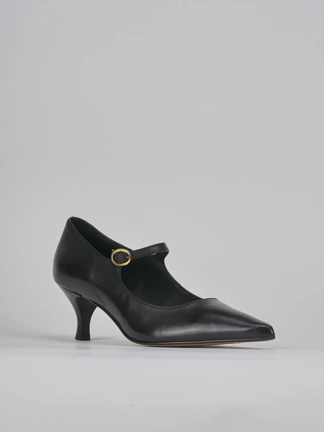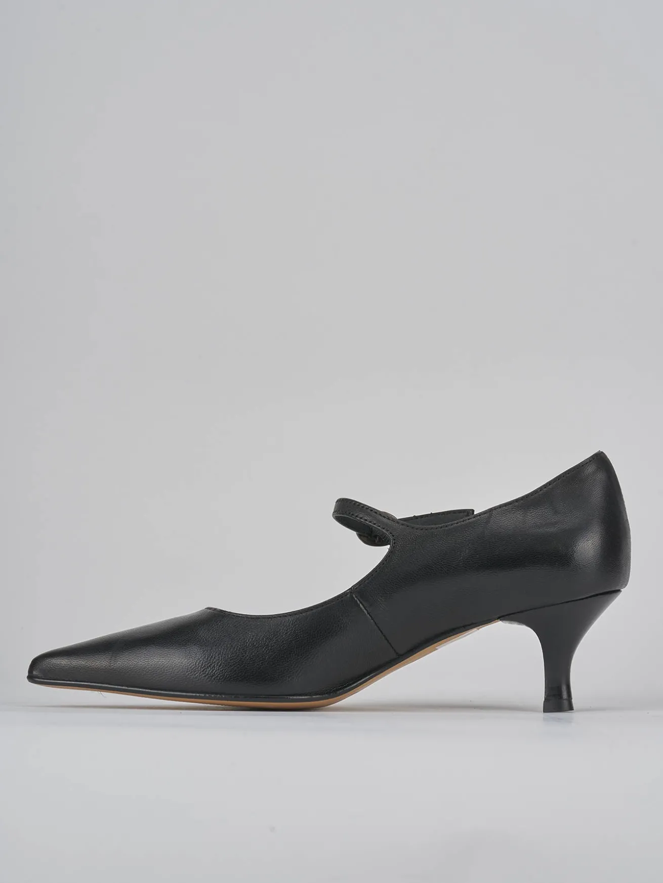 Bebè tacco 5 cm fondo in leggerissima gomma e soletto interno in vera pelle. Tomaia in morbida pelle, punta sfilata, apertura svasata in punta, cinturino regolabile con fibbia e tacco rocchetto. dalla linee semplici, perfetto per qualsiasi tua occasione.